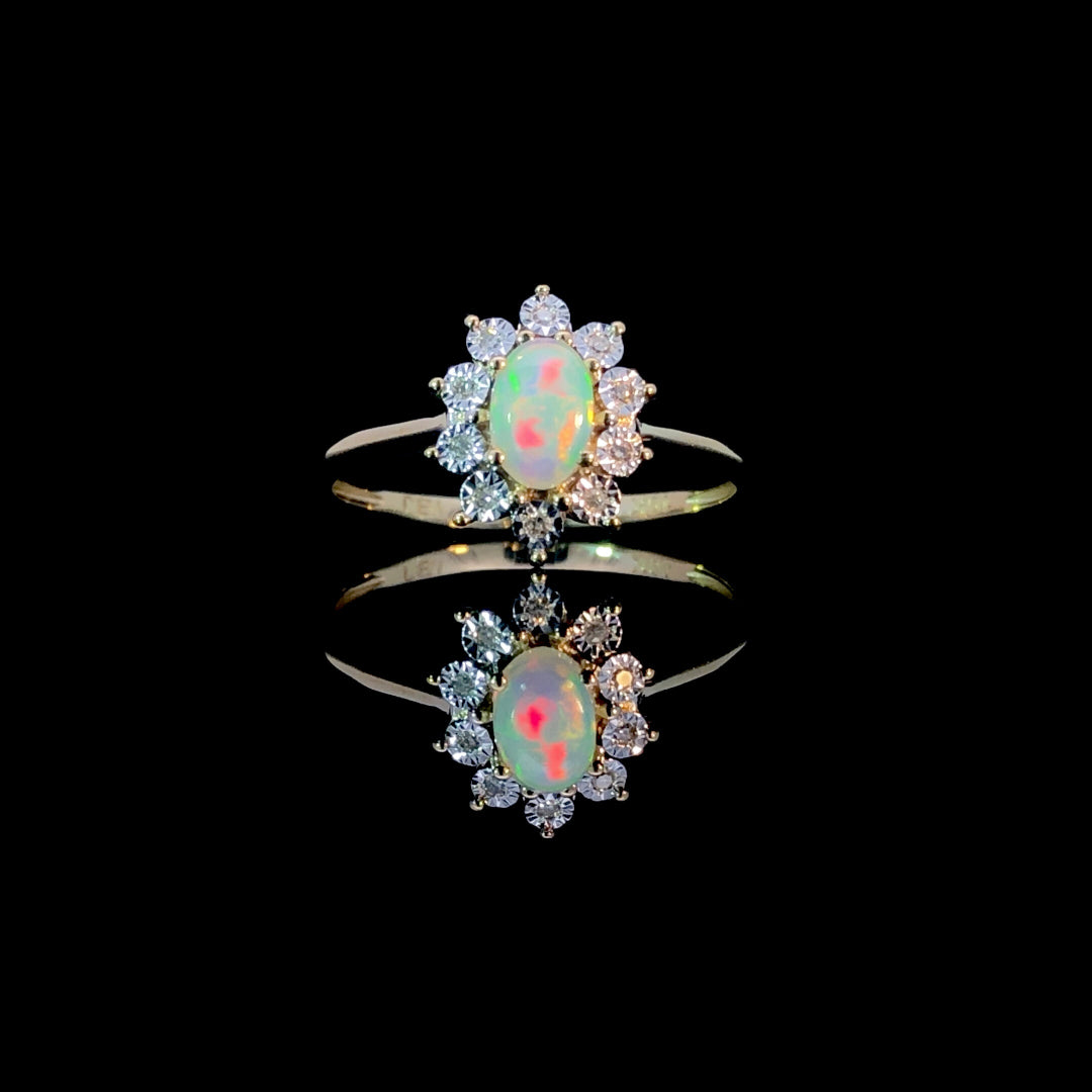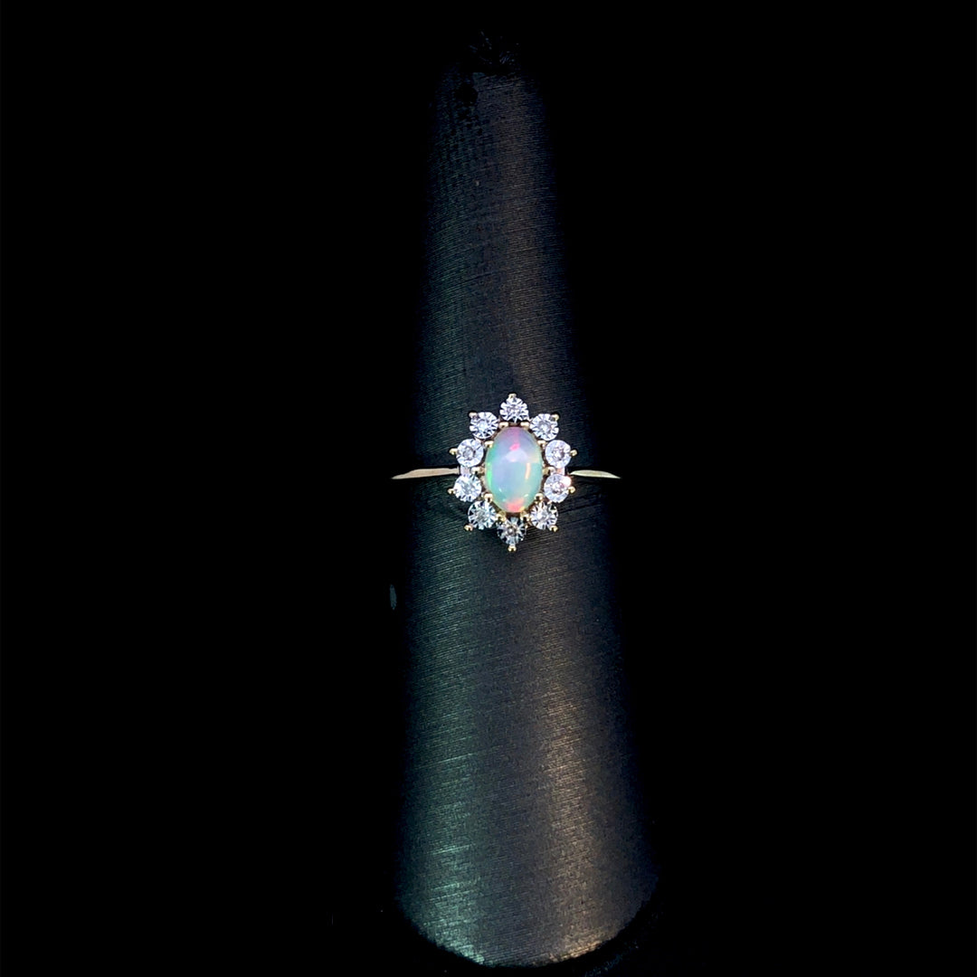 This ring showcases a stunning oval-shaped opal center stone, beautifully surrounded by a .03ctw illusion-set diamond halo. Set on a smooth 10kt yellow gold band, it combines classic design with vibrant color for an elegant and timeless piece. This ring is a size 7. If that size is not a perfect fit, first time sizing is free at the time of purchase. Additional sizing fees may apply.