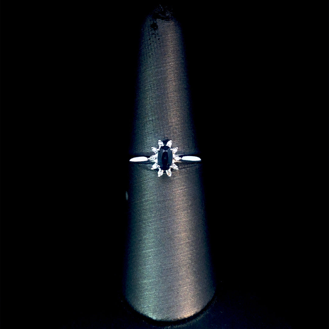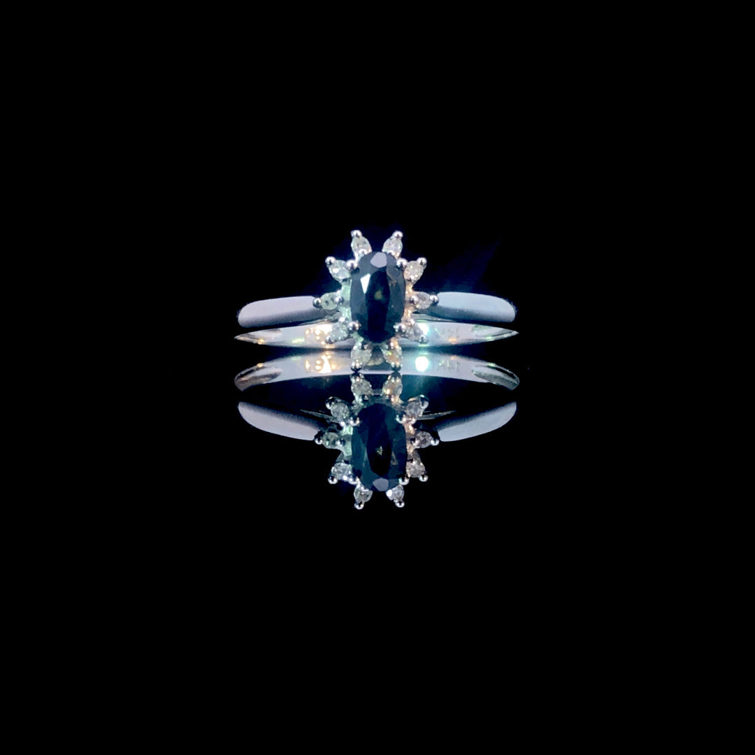This elegant ring showcases a classic oval sapphire centerpiece, gracefully framed by a delicate .04 ctw diamond halo. Set in 10kt white gold, it exudes refined sophistication and timeless charm, making it an exquisite choice for any discerning jewelry collection. This ring is a size 7. If that size is not a perfect fit, first time sizing is free at the time of purchase. Additional sizing fees may apply.