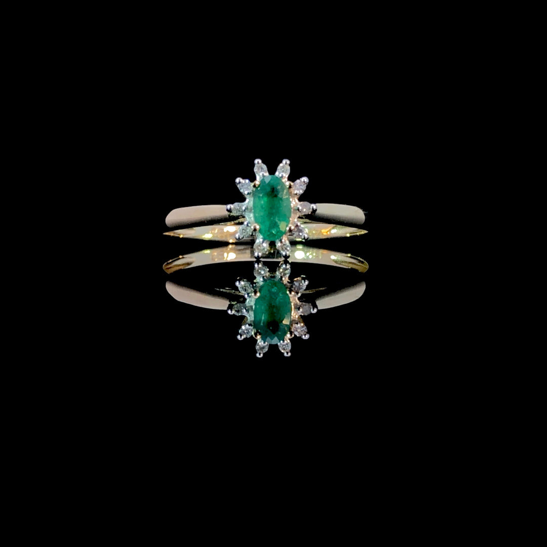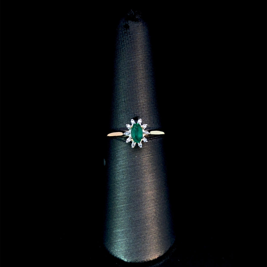 This elegant ring showcases a classic oval emerald centerpiece, beautifully framed by a halo of 0.04ctw of round diamonds. Crafted in 10kt yellow gold, it offers a timeless design that adds a touch of sophistication and enduring charm to your jewelry collection. This ring is a size 7. If that size is not a perfect fit, first time sizing is free at the time of purchase. Additional sizing fees may apply.