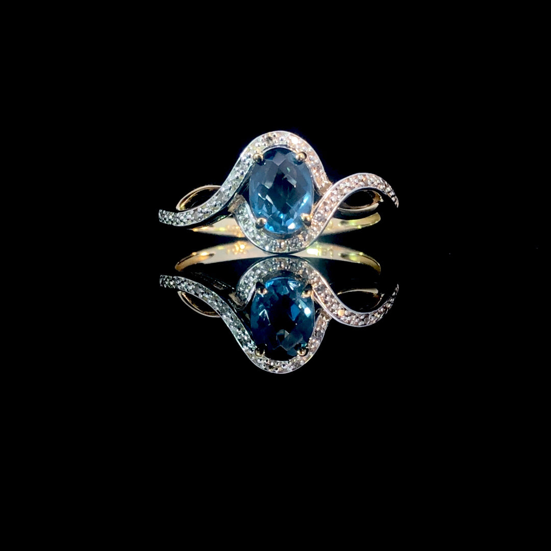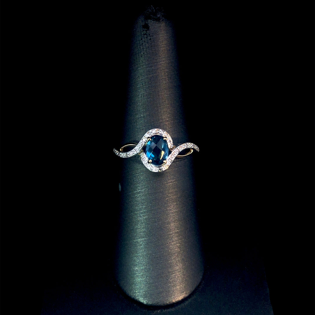 This beautiful ring features a striking blue topaz center stone, elegantly surrounded by .05ctw of round diamond accents in a delicate twist design. Crafted from 10kt yellow gold, it offers a graceful blend of color and sparkle, perfect for adding a touch of sophistication to your jewelry collection. This ring is a size 7.25. If that size is not a perfect fit, first time sizing is free at the time of purchase. Additional sizing fees may apply.