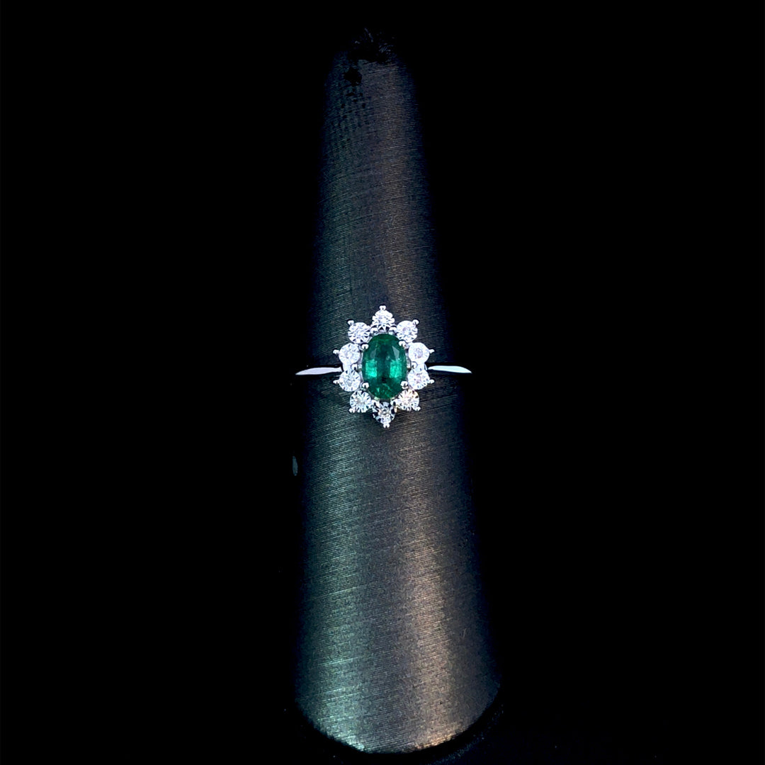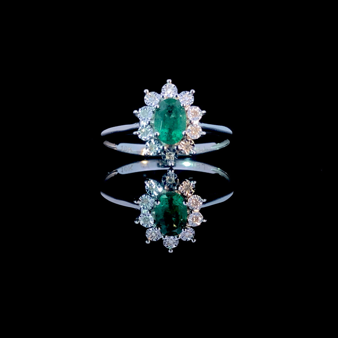 This timeless ring showcases a beautiful oval emerald at its center, surrounded by a delicate halo of .03ctw round diamonds set in 10kt white gold. Its elegant design offers a meaningful way to celebrate special moments with lasting beauty and grace. This ring is a size 7. If that size is not a perfect fit, first time sizing is free at the time of purchase. Additional sizing fees may apply.