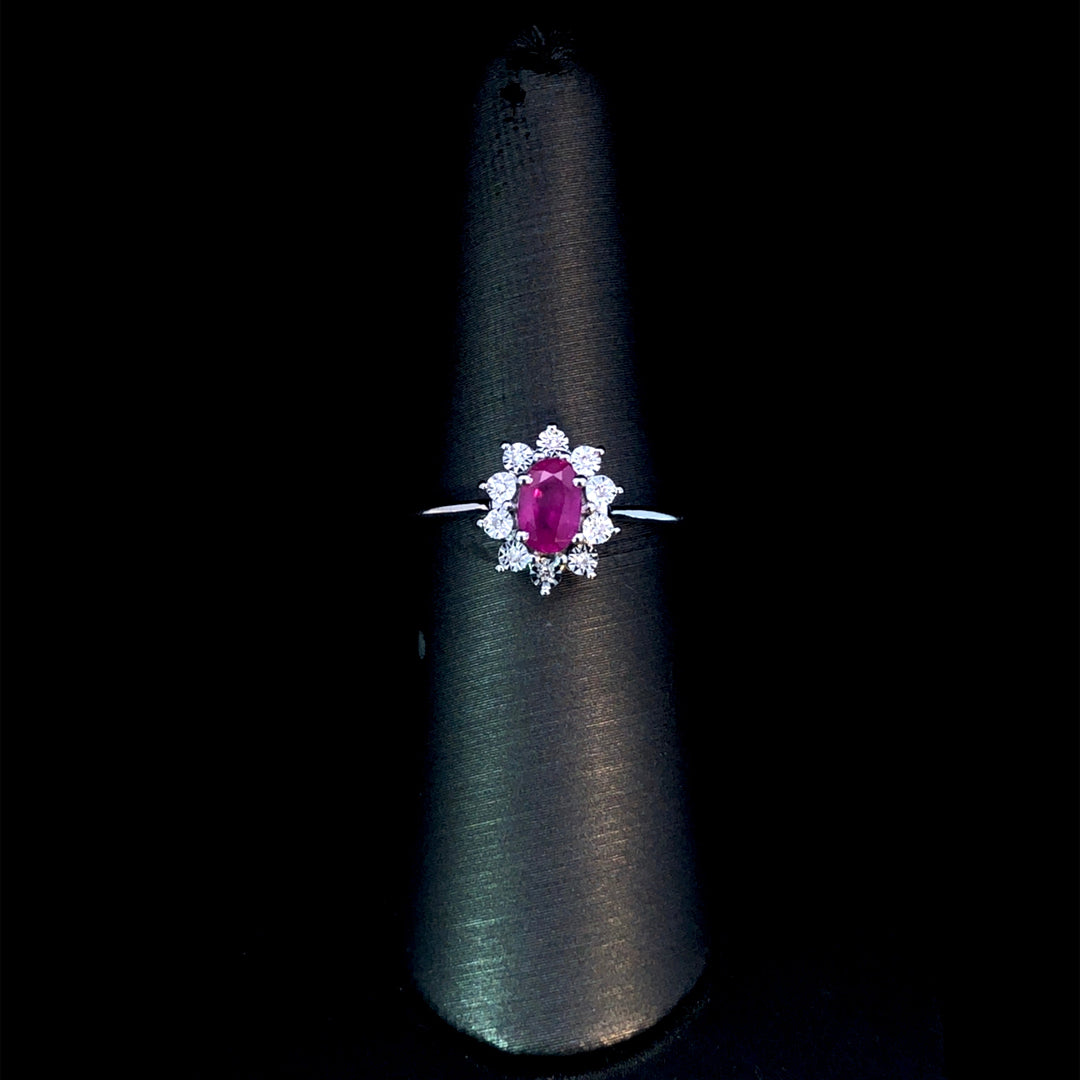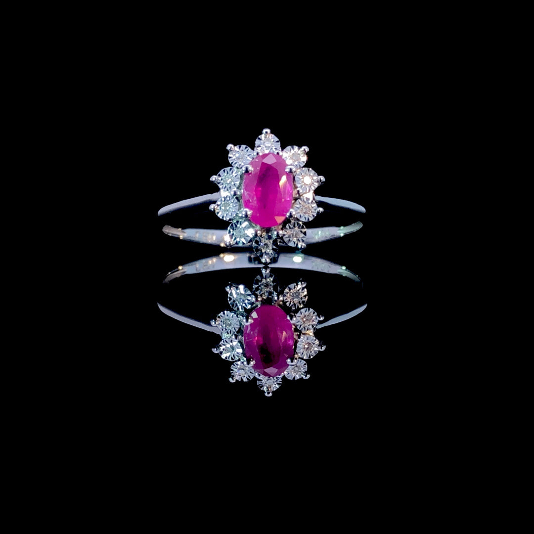 This timeless ring highlights a stunning oval ruby at its center, encircled by a halo of round diamonds totaling 0.03 carats set in illusion-style heads. Crafted in 10kt white gold, it offers a classic and elegant look that beautifully showcases the vibrant ruby. This ring is a size 7. If that size is not a perfect fit, firs time sizing is free at the time of purchase. Additional sizing fees may apply.