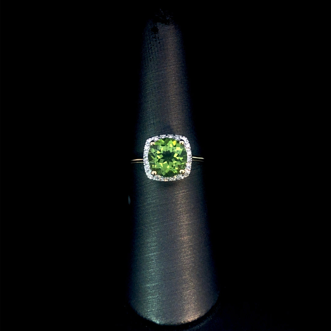 This classic ring highlights a vibrant round peridot center stone, beautifully encircled by a diamond halo. Set on a smooth 10kt yellow gold band, it offers a timeless design that combines elegance with everyday comfort. This ring is a size 7. If that size is not a perfect fit, first time sizing is free at the time of purchase. Additional sizing fees may apply.