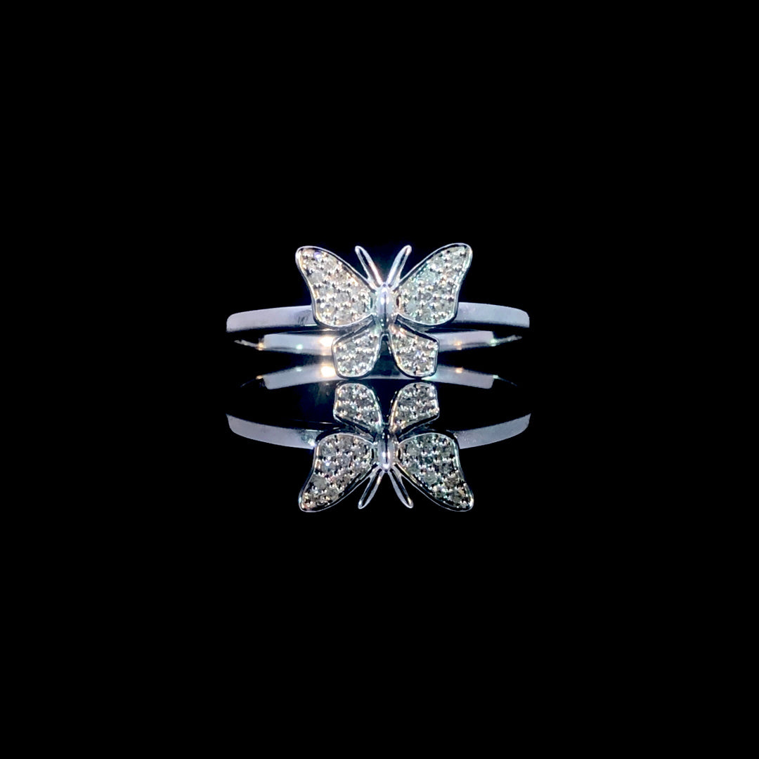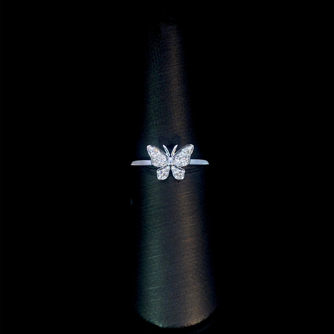 This charming butterfly ring adds a playful touch to your collection. Crafted from 10kt white gold and accented with .07 ctw of round diamonds, it delivers a subtle sparkle that enhances your everyday style with grace and fun. This ring is a size 7. If that size is not a perfect fit, first time sizing is free at the time of purchase. Additional sizing fees may apply.