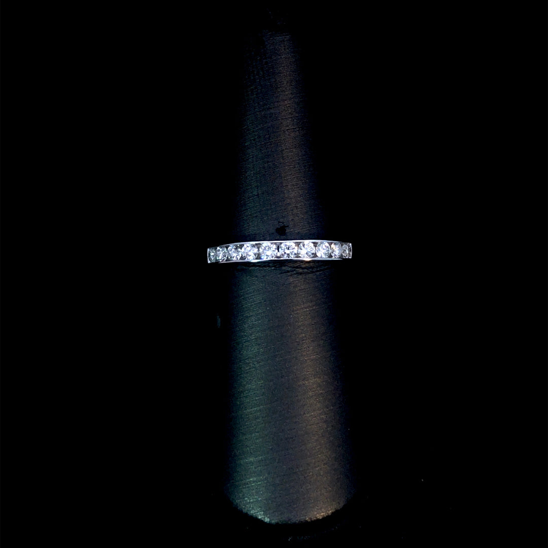 This classic diamond band features 0.49ctw of round diamonds channel set in 14kt white gold. Its sleek design offers enduring elegance and a brilliant sparkle, making it a perfect addition to any jewelry collection. This ring is a size 6.5. If that size is not a perfect fit, first time sizing is free at the time of purchase. Additional sizing fees may apply.