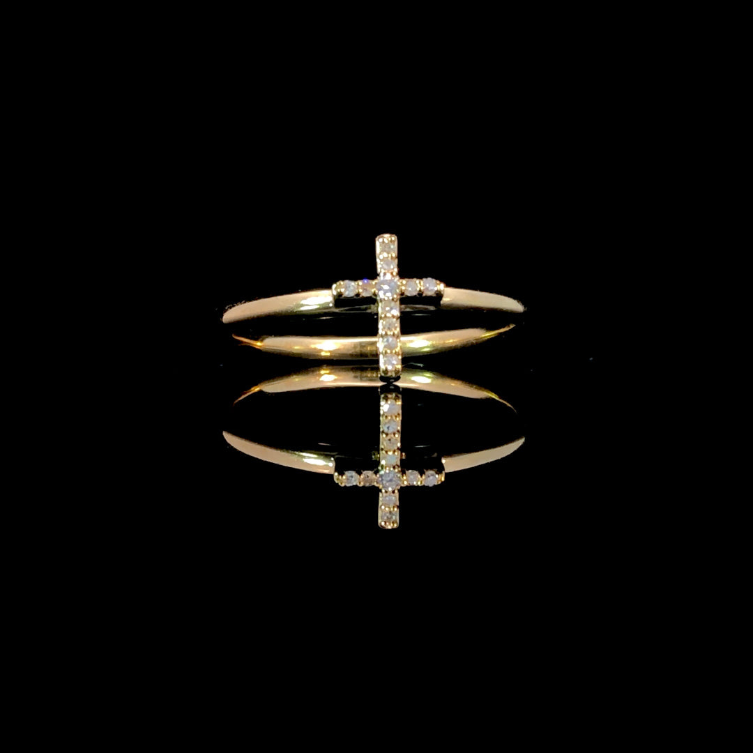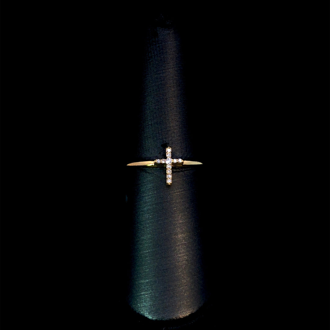 This diamond cross ring offers a stylish way to express your faith. Featuring a cross adorned with 0.05ctw of round diamonds, it is set in warm 14kt yellow gold for a refined and meaningful look you can wear every day. This ring is a size 7. If that size is not a perfect fit, first time sizing is free at the time of purchase. Additional sizing fees may apply.