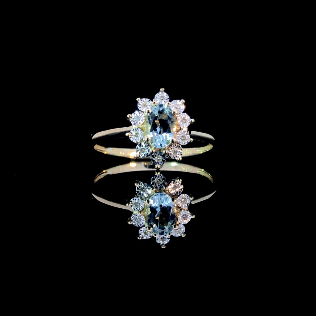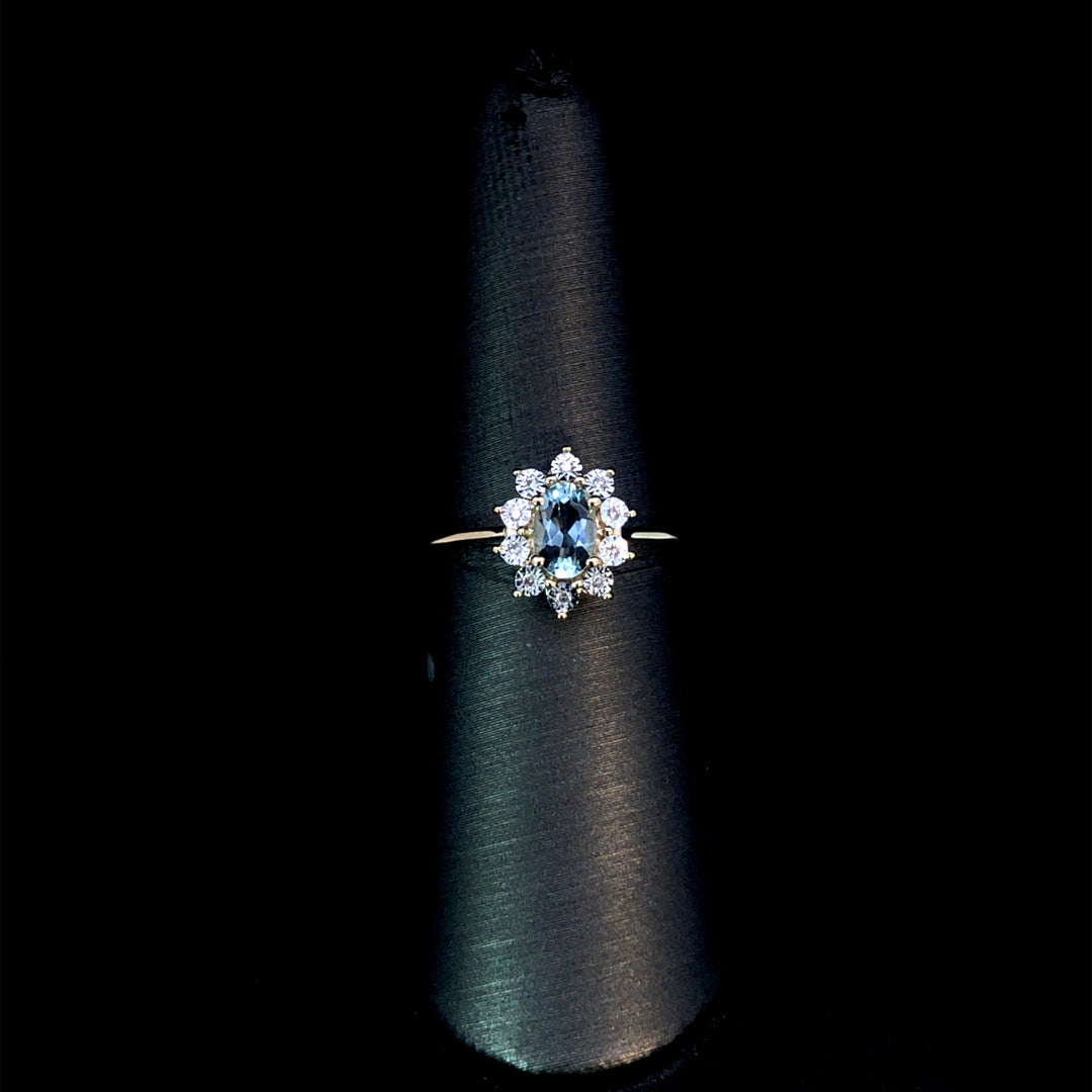 This stunning ring highlights an oval aquamarine center stone, beautifully framed by a halo of 0.03ctw of round diamonds. Set on a smooth 10kt yellow gold band, it offers a timeless and elegant design that adds a touch of sparkle and sophistication to any look. This ring is a size 7. If that size is not a perfect fit, first time sizing is free at the time of purchase. Additional sizing fees may apply.