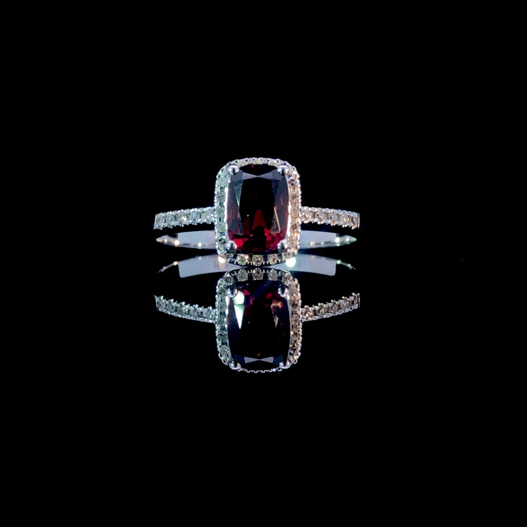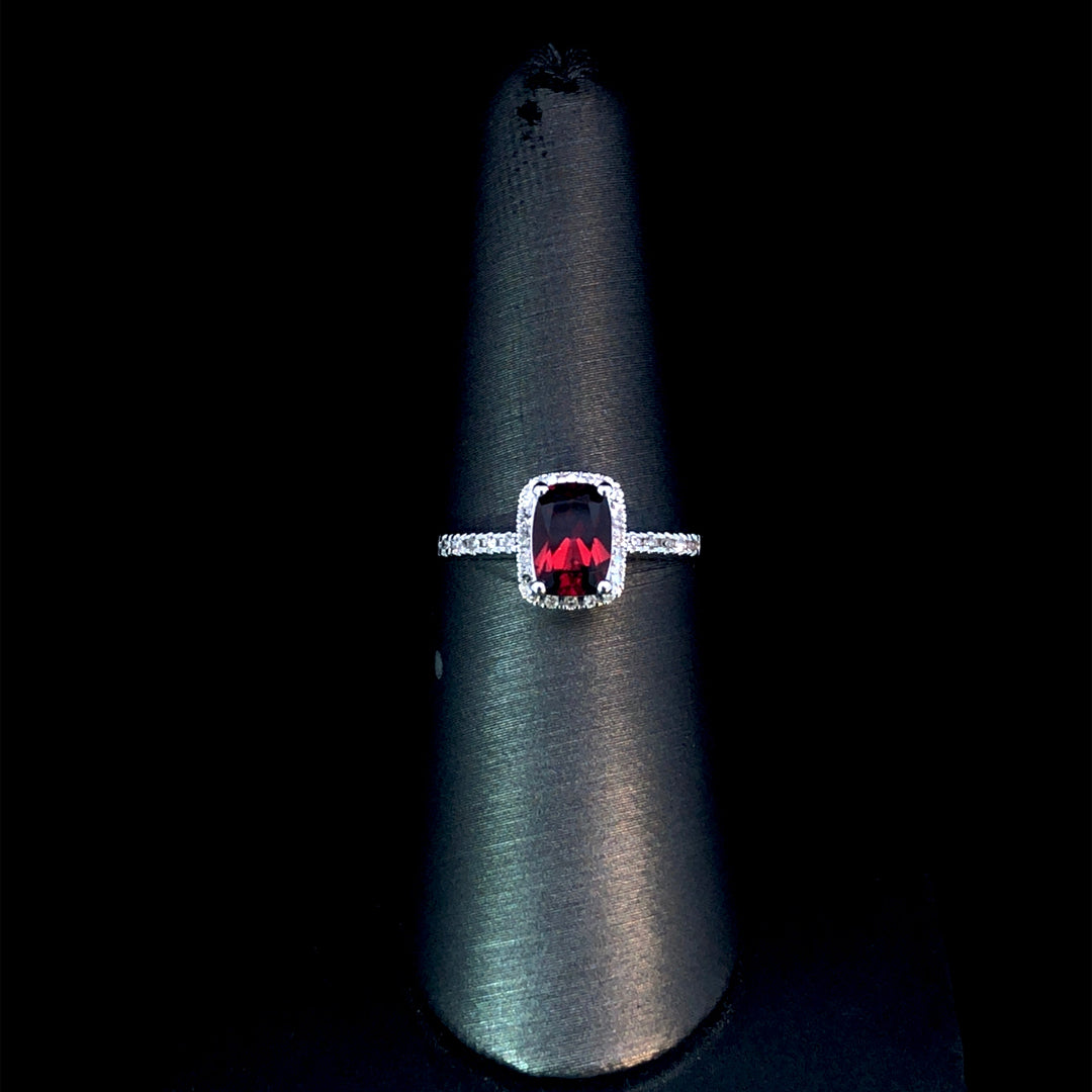 This stunning ring features an elongated cushion-cut garnet at its center, beautifully framed by a diamond halo and accented with diamonds cascading down the band. With a total diamond weight of .10ctw set in 10kt white gold, it offers a perfect blend of vibrant color and elegant sparkle for a truly memorable piece. This ring is a size 7.5. If that size is not a perfect fit, first time sizing is free at the time of purchase. Additional sizing fees may apply.