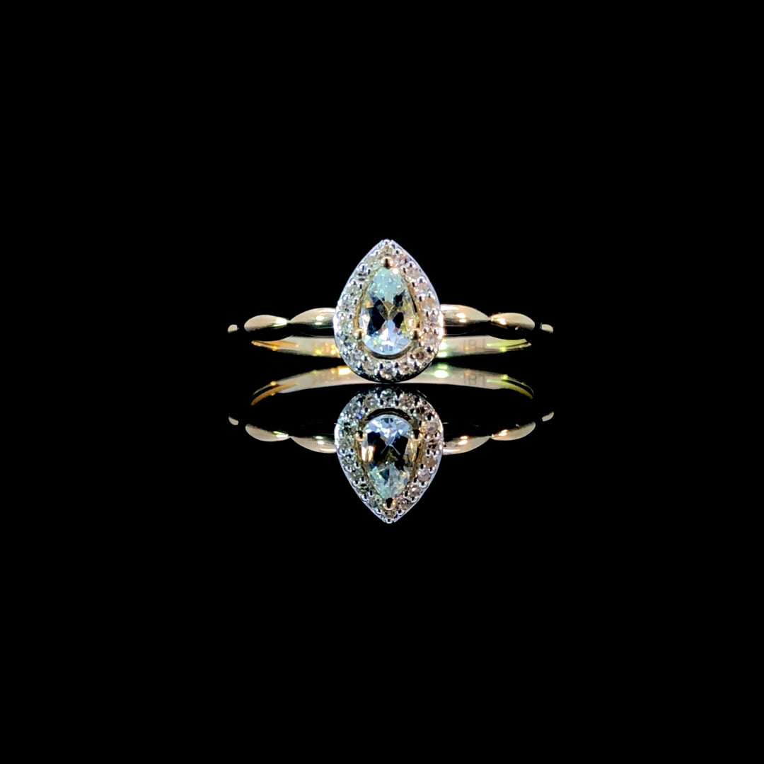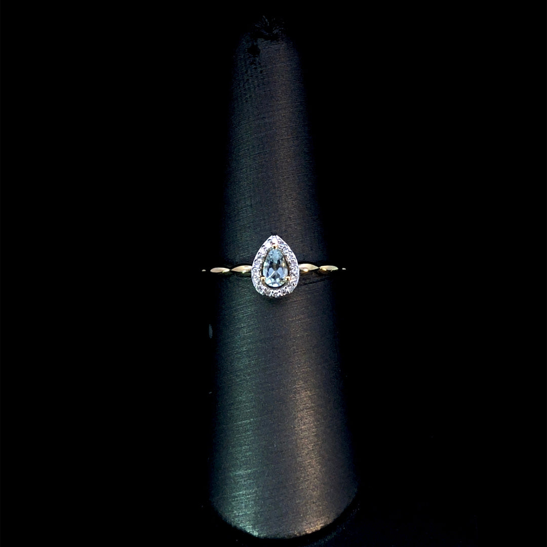 This chic ring brings a fresh, trendy touch to your collection with a pear-shaped aquamarine center stone. It’s beautifully framed by a .06ctw diamond halo and set on a unique 10kt yellow gold bubble band. This ring is a size 7. If that size is not a perfect fit, first time sizing is free at the time of purchase. Additional sizing fees may apply.