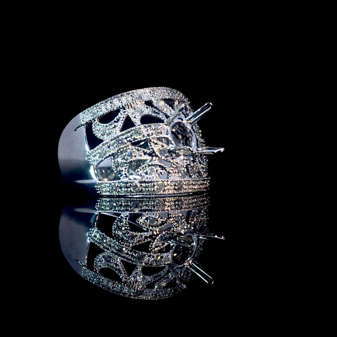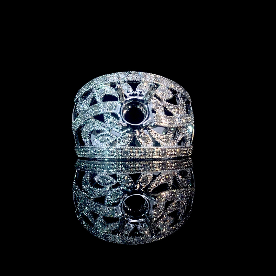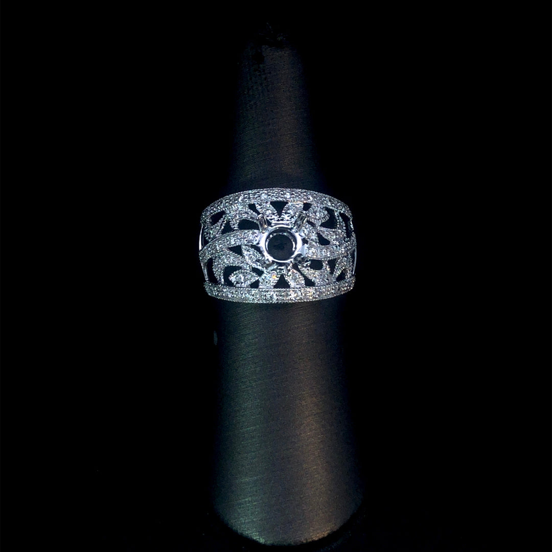 This beautiful semi-mount showcases an intricate design with .35tw of round diamonds and delicate milgrain details, all set in 14kt white gold. You have the freedom to select your own center stone from our wide collection of loose stones, allowing you to create a truly meaningful and personalized piece. Price is for the semi mount only. Center stone will be added at an additional cost. This ring is a size 6.5. If that size is not a perfect fit, first time sizing is free at the time of purchase. Additional sizing fees may apply.