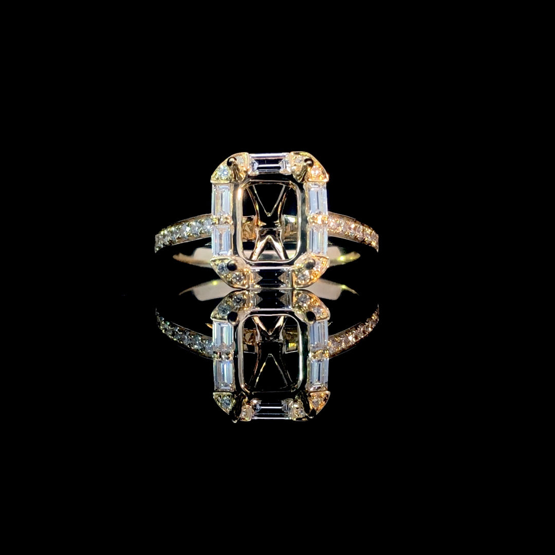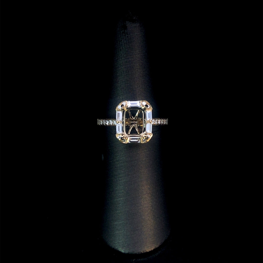 This dazzling diamond semi-mount shines with a halo of baguette diamonds and round diamonds cascading down the 14kt yellow gold band, totaling 0.59ctw. Ready for your personal touch, you can complete this sparkling piece by selecting your favorite center stone from our wide collection of loose stones. Price is for the semi mount only. Center stone will be added at an additional cost. This ring is a size 6.5. If that size is not a perfect fit, first time sizing is free at the time of purchase. Additional sizing fees may apply.