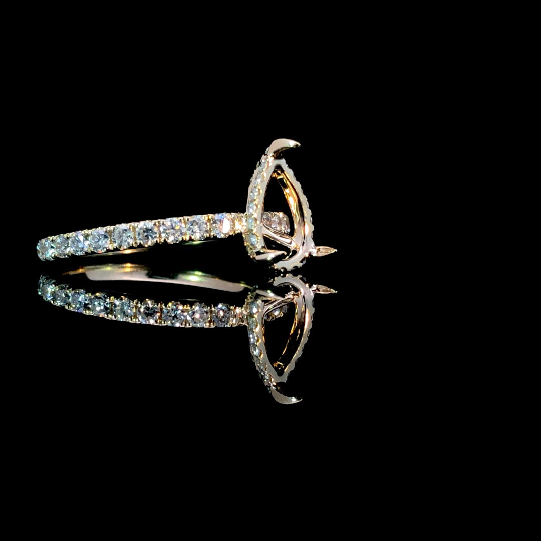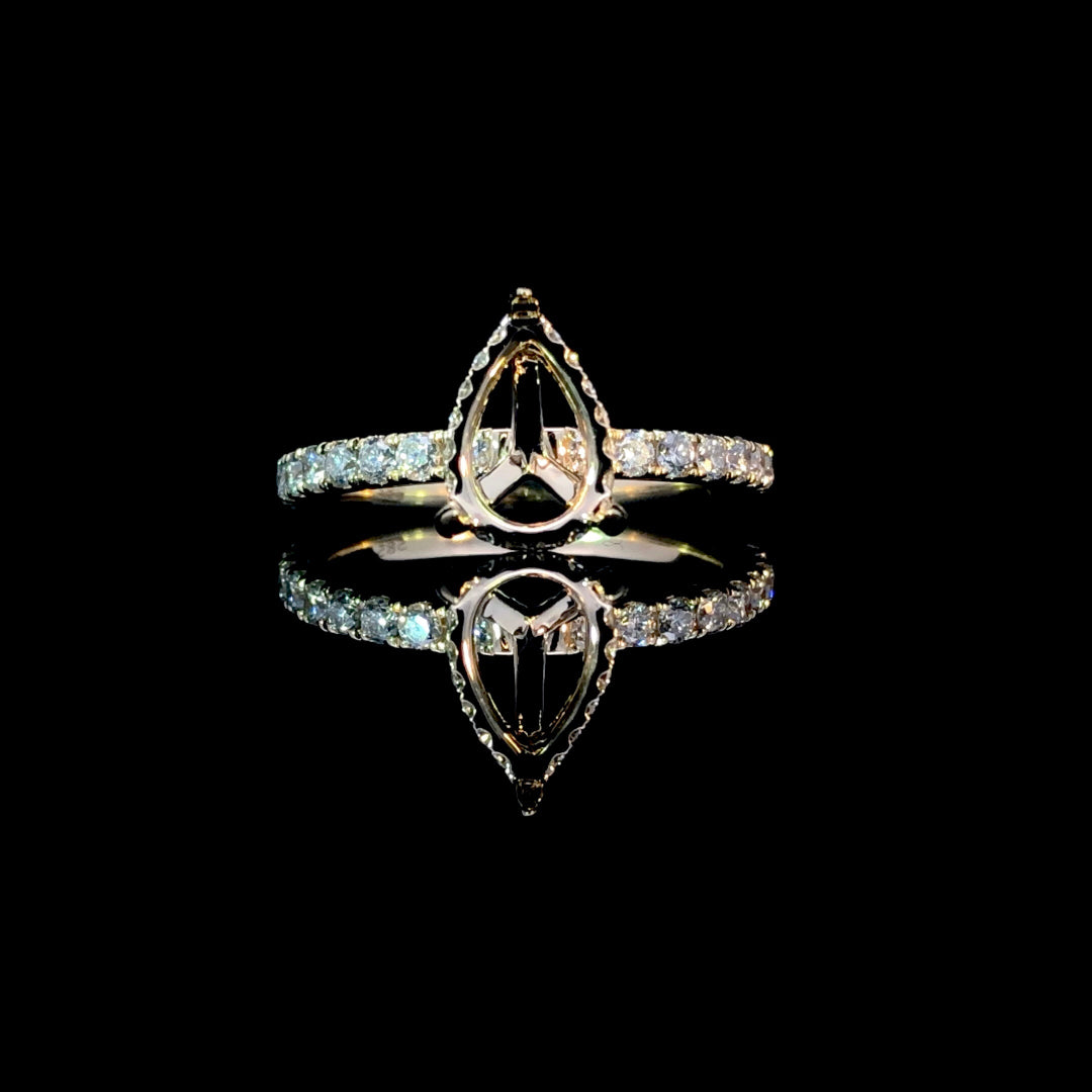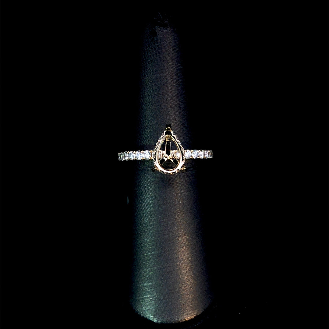 This stunning diamond semi-mount showcases a pear-shaped hidden halo, enhanced by additional diamonds on the prongs and band for a total diamond weight of .75ctw. Set in warm 14kt yellow gold, it offers a brilliant and elegant foundation for your perfect center stone. Let us help you create a meaningful and beautiful ring that reflects your unique love story. Price is for the semi mount only. Center stone will be added at an additional cost. This ring is a size 6.5. If that size is not a perfect fit, first time sizing is free at the time of purchase. Additional sizing fees may apply.