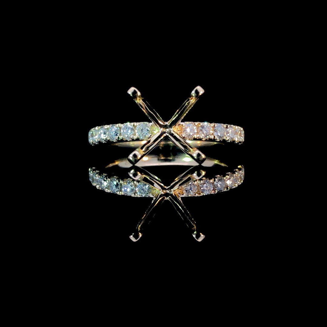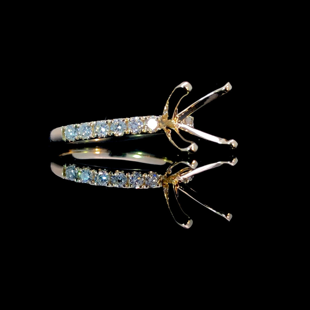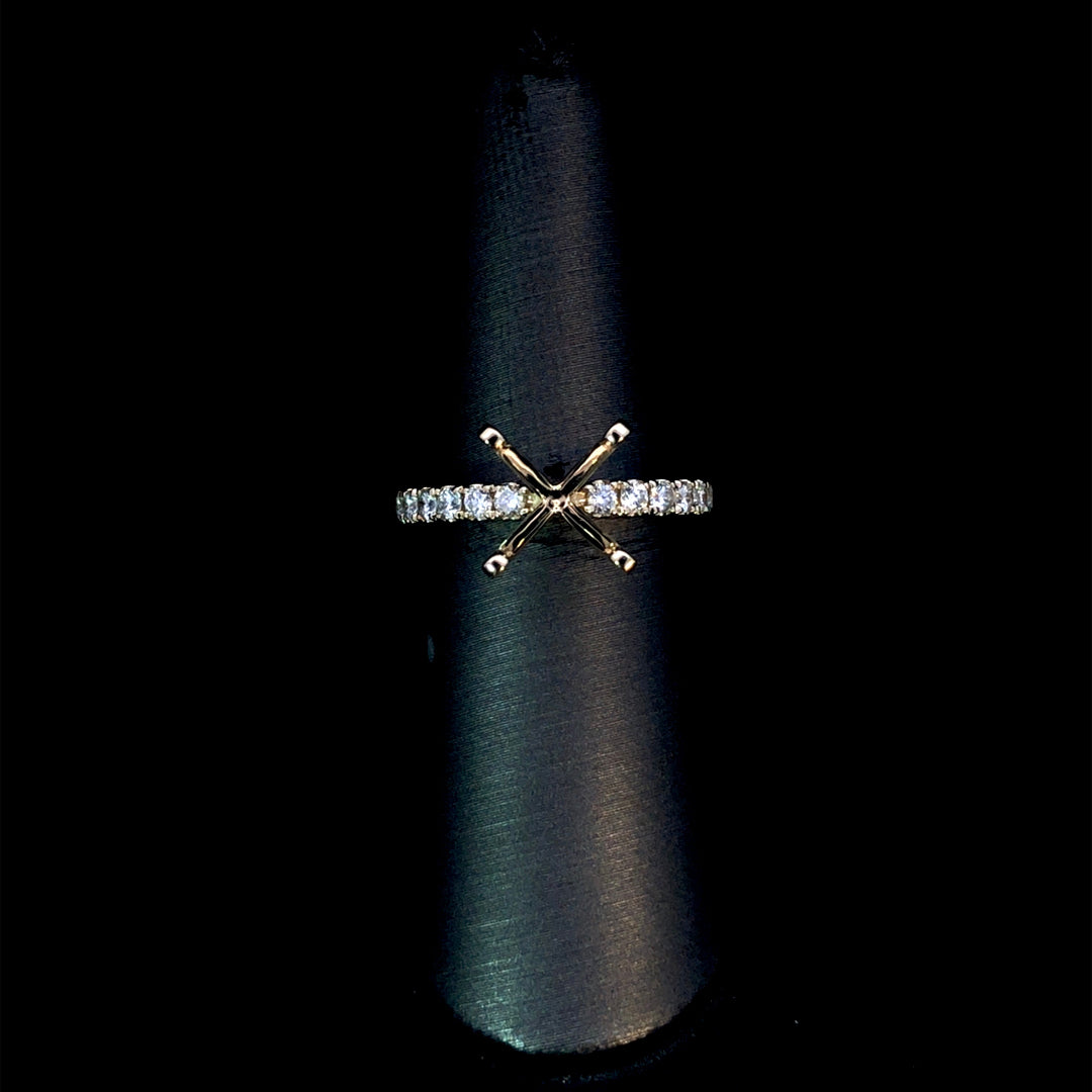 This classic diamond semi-mount features .48ctw of round diamonds set on a warm 14kt yellow gold band. It provides a timeless and elegant foundation for your perfect center stone. Choose from our unmatched selection of loose stones to create a personalized ring that beautifully reflects your unique style. Price is for the semi mount only. Center stone will be added at an additional cost. This ring is a size 6.5. If that size is not a perfect fit, first time sizing is free at the time of purchase. Additional sizing fees may apply.