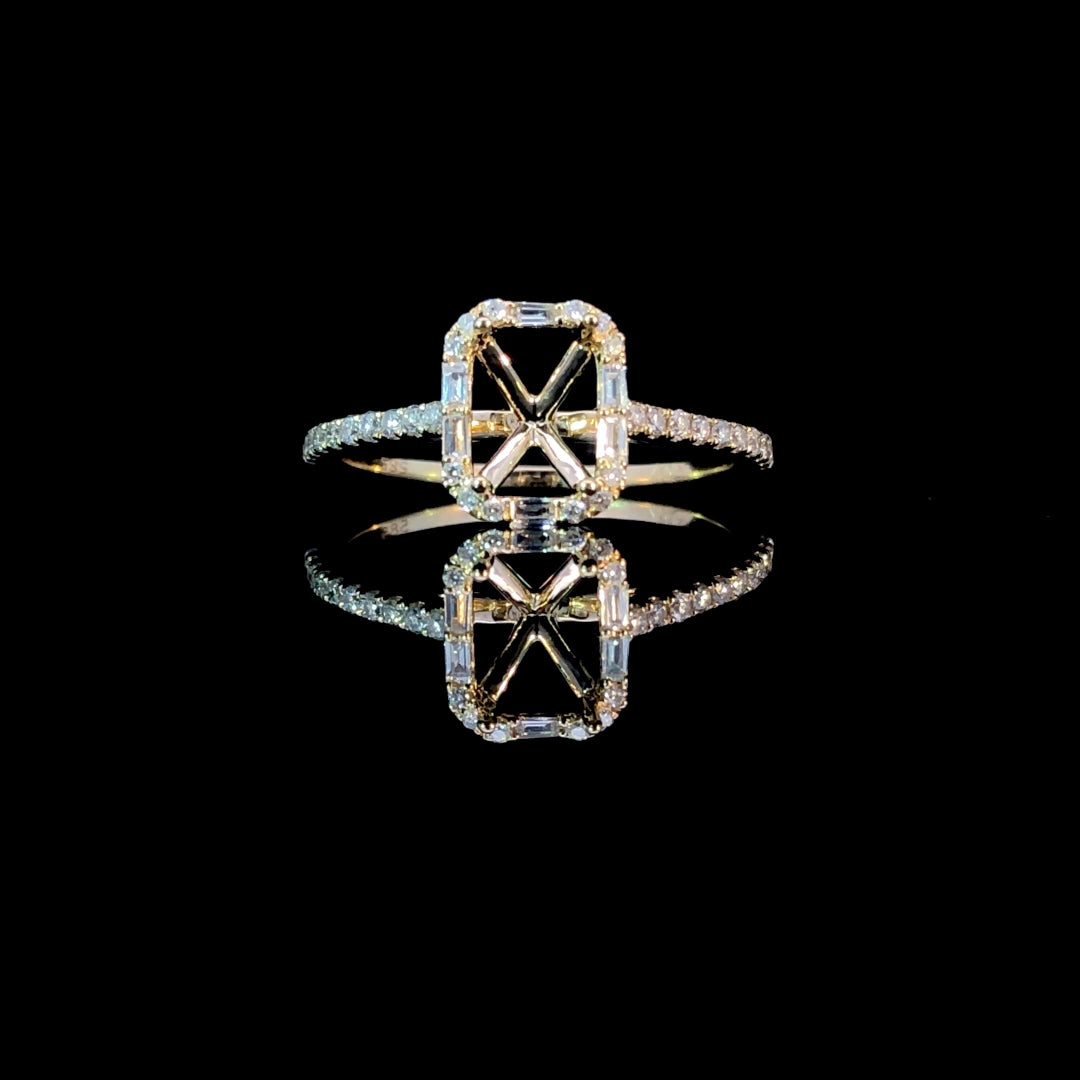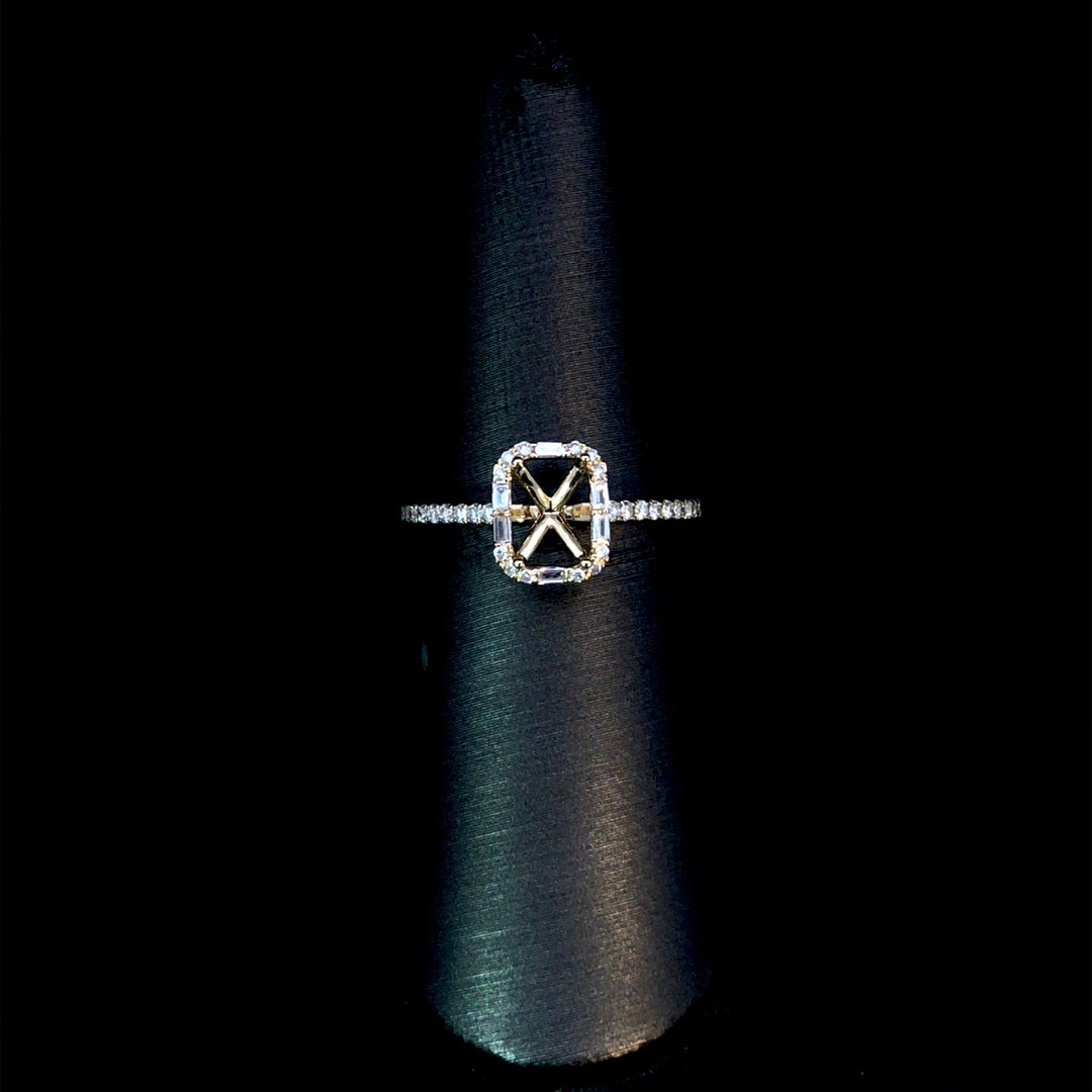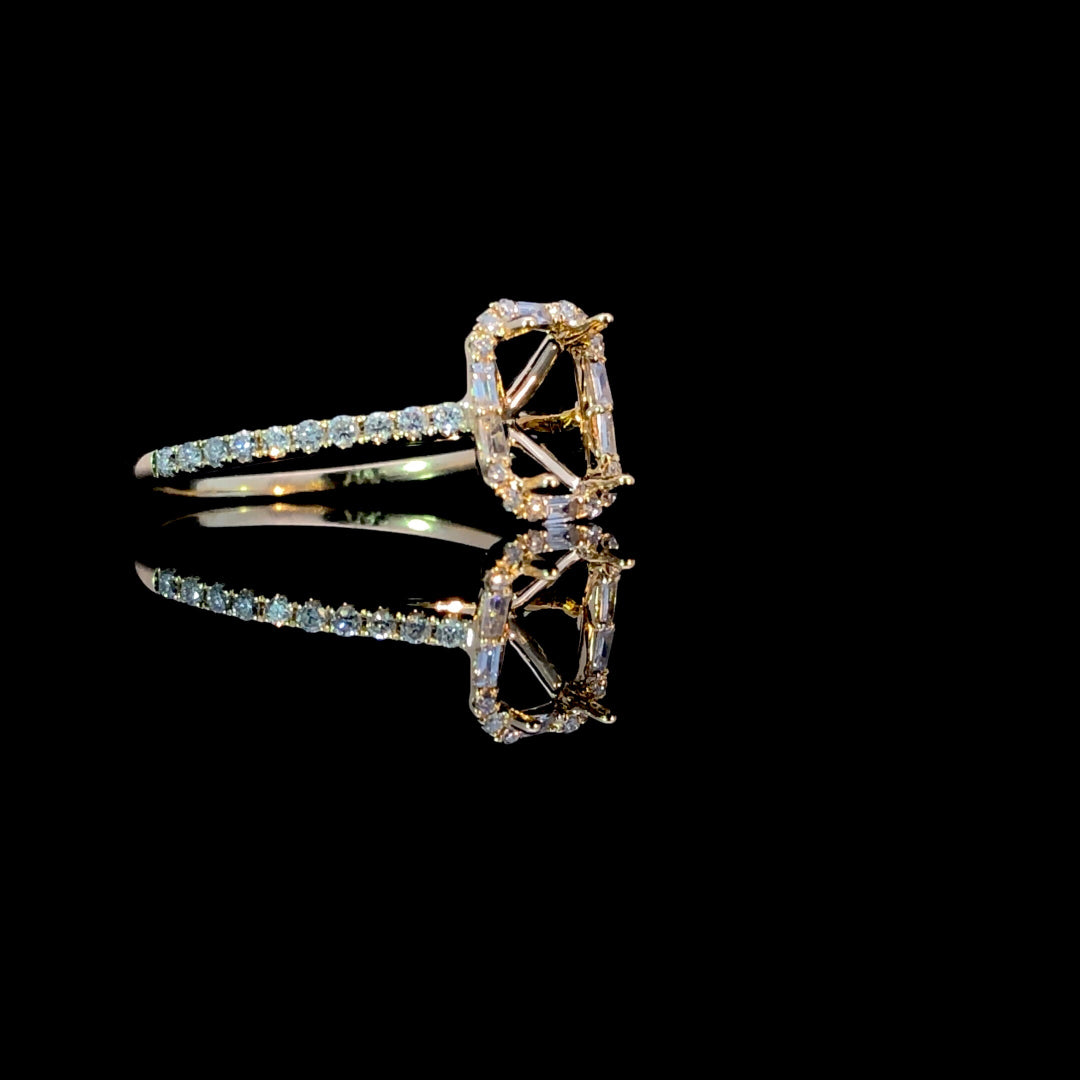 This gorgeous diamond semi-mount features a stunning halo of round and baguette diamonds, complemented by round diamonds along the band for a total carat weight of .26ctw. Set in warm 14kt yellow gold, it offers a beautiful foundation for your perfect center stone. Choose from our extensive collection of loose stones to create a personalized piece that reflects your unique style and story. Price is for the semi mount only. Center stone will be added at an additional cost. This ring is a size 6.5. If that size is not a perfect fit, first time sizing is free at the time of purchase. Additional sizing fees may apply.