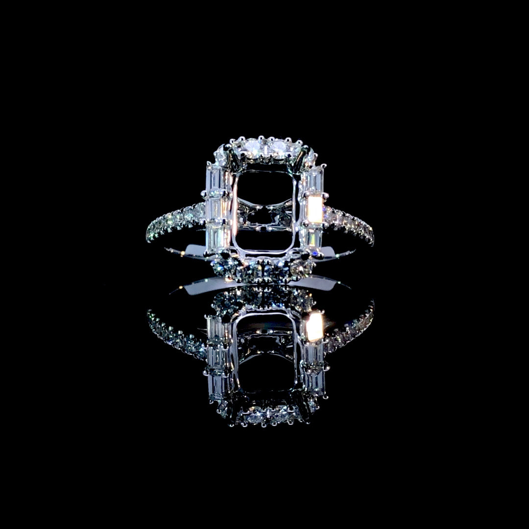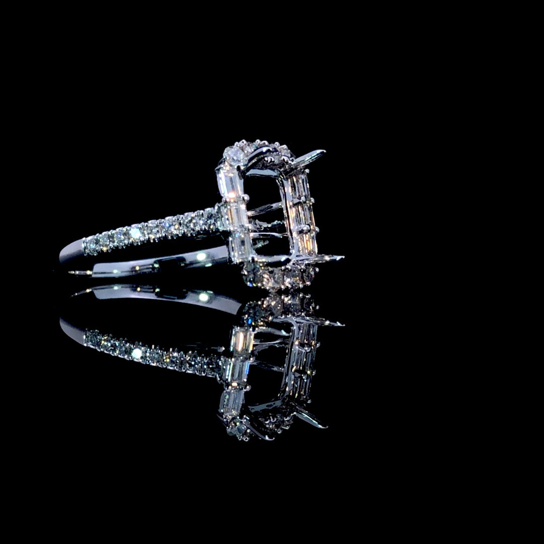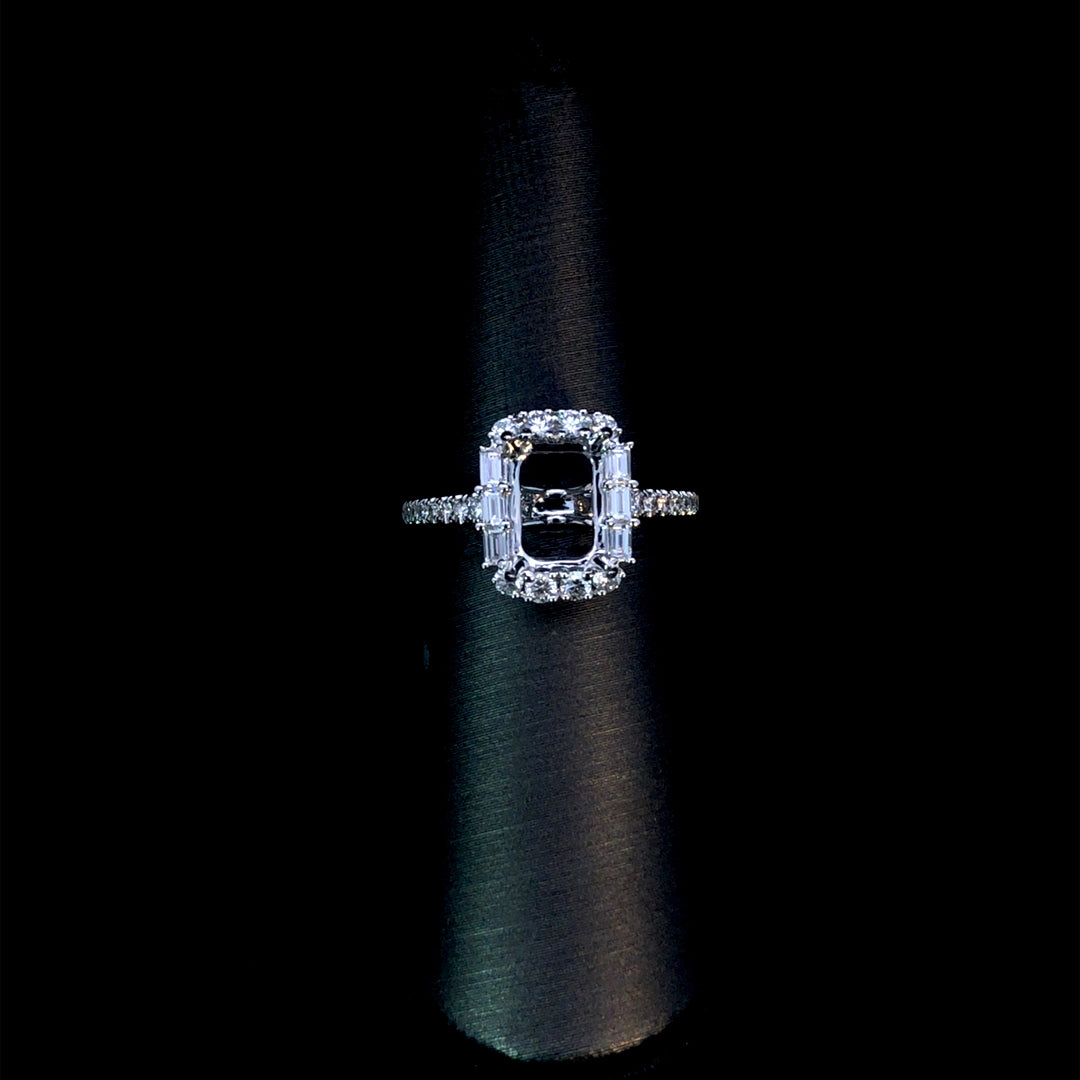 This stunning diamond semi-mount features a halo of round and baguette diamonds, complemented by additional round diamonds cascading down the 14kt white gold band. With a total diamond weight of 0.65ctw, it offers a brilliant and elegant setting ready to showcase your perfect center stone. Price is for the semi mount only. Center stone will be added at an additional cost. This ring is a size 6.5. If that size is not a perfect fit, first time sizing is free at the time of purchase. Additional sizing fees may apply.