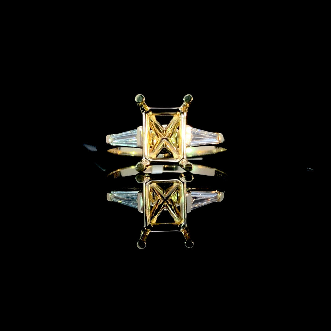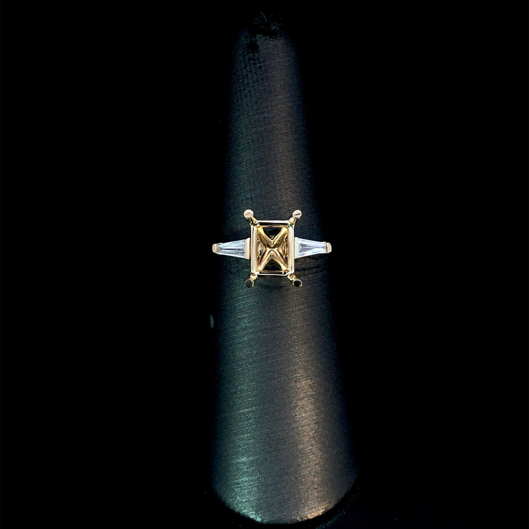 This elegant semi-mount ring is crafted in 14kt yellow gold and designed to showcase your choice of a rectangular center stone. It features two baguette side stones totaling 0.21ctw, adding subtle sparkle and sophistication. Customize this piece by selecting your perfect center stone from our extensive collection to create a truly unique and meaningful ring. Price is for the semi mount only. Center stone will be added at an additional cost. This ring is a size 7. If that size is not a perfect fit, first time sizing is free at the time of purchase. Additional sizing fees may apply.