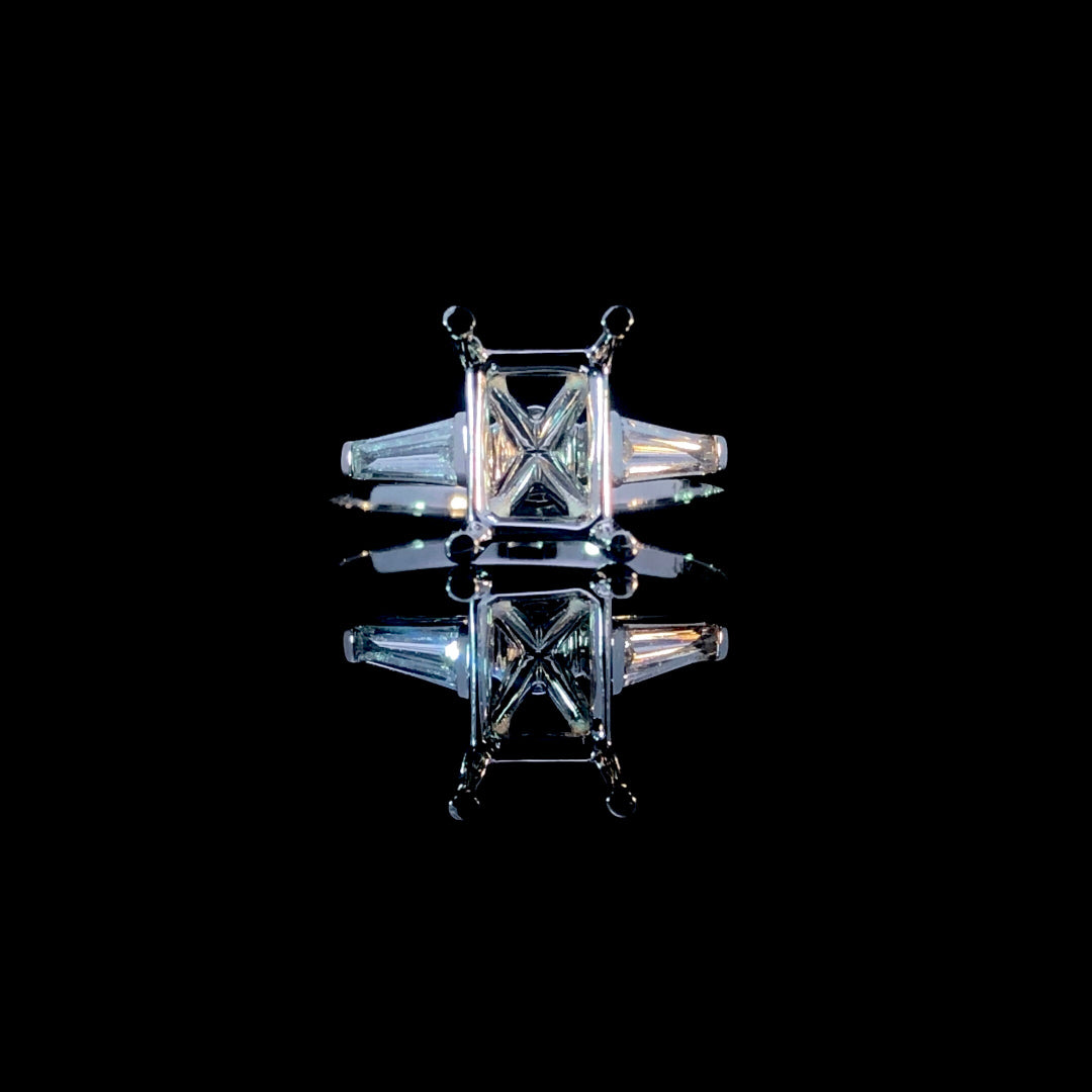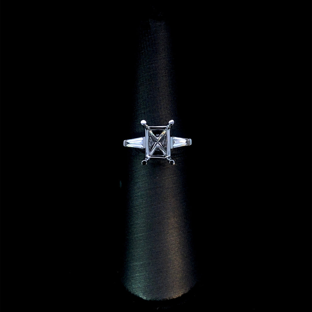 This diamond semi-mount offers a timeless setting to showcase your chosen center diamond from our extensive loose stone collection. Featuring two baguette side diamonds totaling 0.21ctw, set in 14kt white gold, it combines classic elegance with personalized style. Price is for the semi mount only. Center stone will be added at an additional cost. This ring is a size 6.5. If that size is not a perfect fit, first time sizing is free at the time of purchase. Additional sizing fees may apply.
