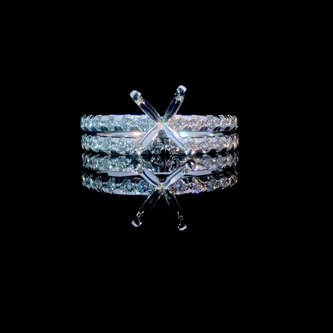 This stunning diamond semi mount features .53ctw of round diamonds set along a 14kt white gold band, providing a brilliant frame for the center stone of your choice. Designed to pair beautifully with any loose stone from our collection, it offers a customizable and elegant foundation. For a complete bridal set, pair it with the matching .56ctw diamond band (sold separately), creating a timeless and classic set you'll treasure forever. Price is for the semi mount only. Center stone and band will be added at an additional cost. This ring is a size 6.5. If that size is not a perfect fit, first time sizing is free at the time of purchase. Additional sizing fees may apply.
