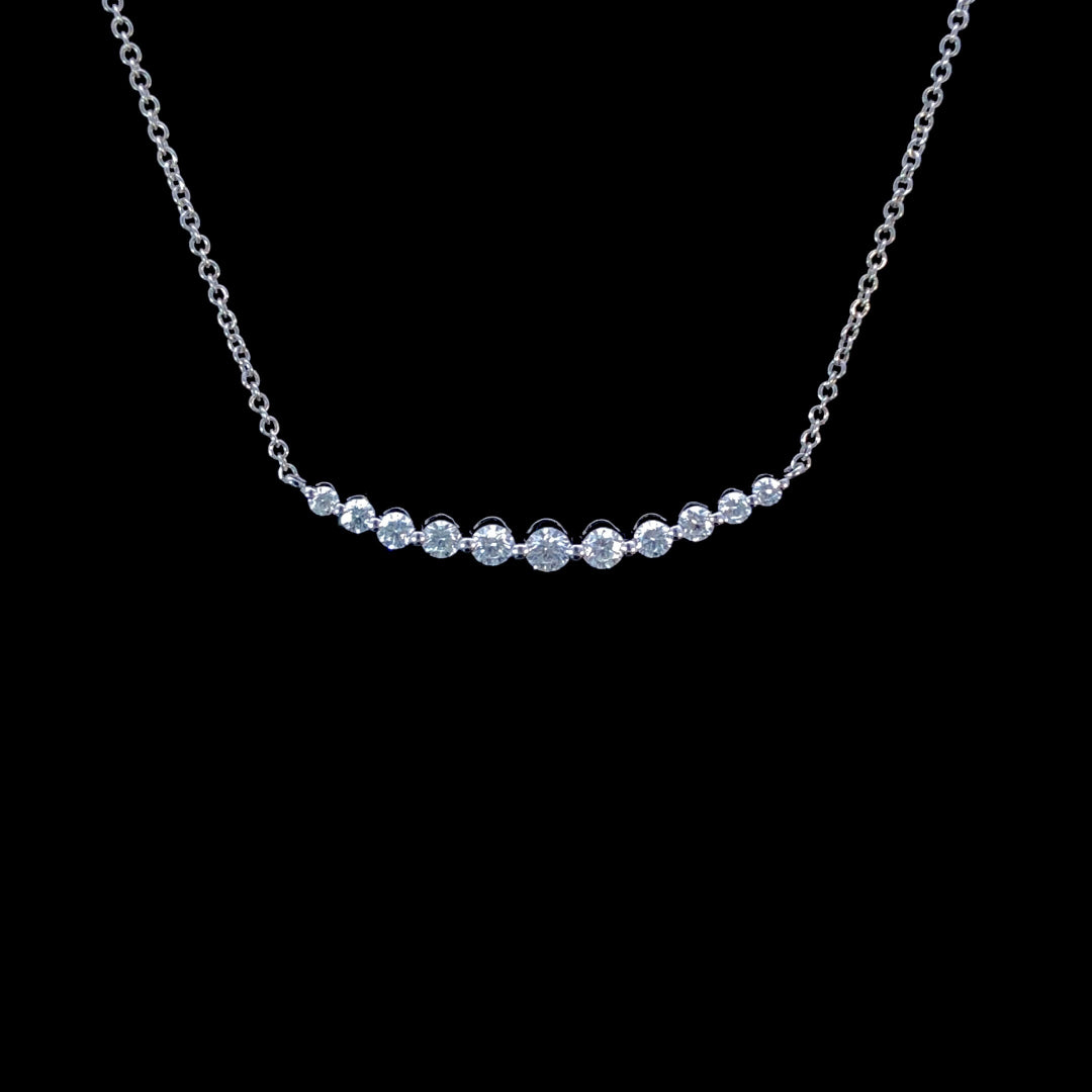 This chic diamond necklace is the perfect addition to your jewelry collection. The curved bar is decorated with .50ctw of round graduating diamonds set in 14kt white gold. With an adjustable 18-inch chain, this piece is perfect for stacking.