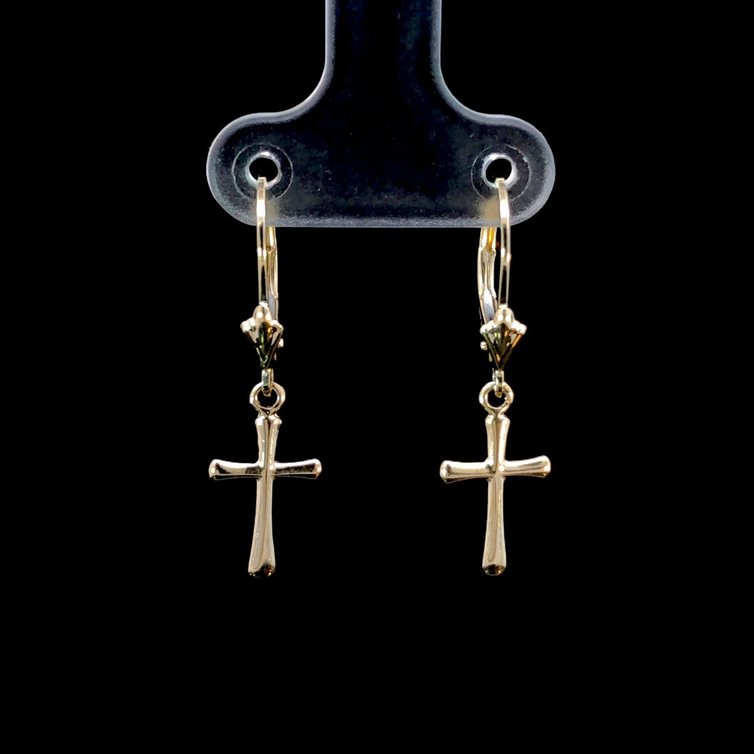 These elegant dangle earrings showcase a delicate cross suspended from a secure 14kt yellow gold lever back. Perfect for daily wear or special occasions, these earrings bring an elegant touch to your jewelry collection.