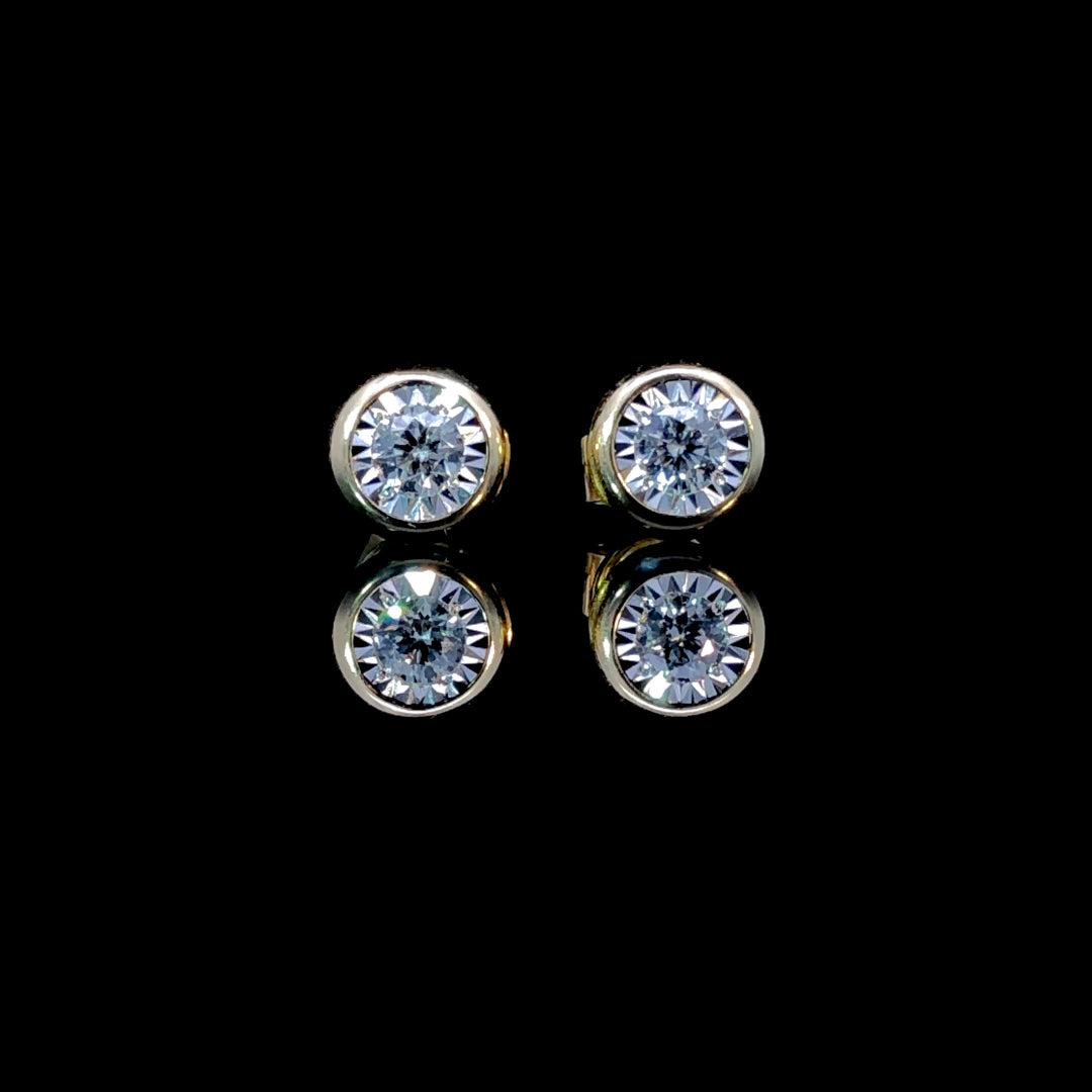 These elegant diamond stud earrings showcase a total of 0.25ctw of round diamonds, beautifully illusion set in a 14kt yellow gold bezel. Their classic design offers a subtle sparkle that complements any outfit, making them a perfect everyday accessory or a thoughtful gift.