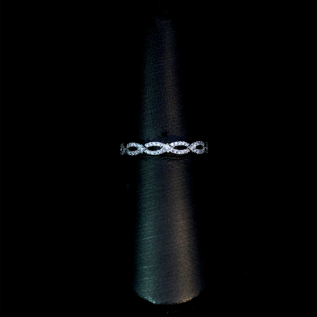 This beautiful diamond band features a twisted design, sparkling with 0.15ctw of round diamonds set in 14kt white gold. Its delicate shimmer and unique design make it a perfect choice to add elegance and charm to your everyday jewelry collection. This ring is a size 7. If that size is not a perfect fit, it can be sized up 2 sizes for free at the time of purchase. Additional sizing fees may apply.