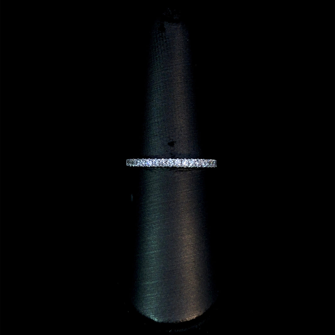 This classic diamond band showcases 0.75ctw of round diamonds beautifully set in 14kt white gold. Its timeless design offers a brilliant sparkle that enhances any style, making it a perfect choice for everyday wear. This ring is a size 7. If that size is not a perfect fit, first time sizing is free at the time of purchase. Additional sizing fees may apply.