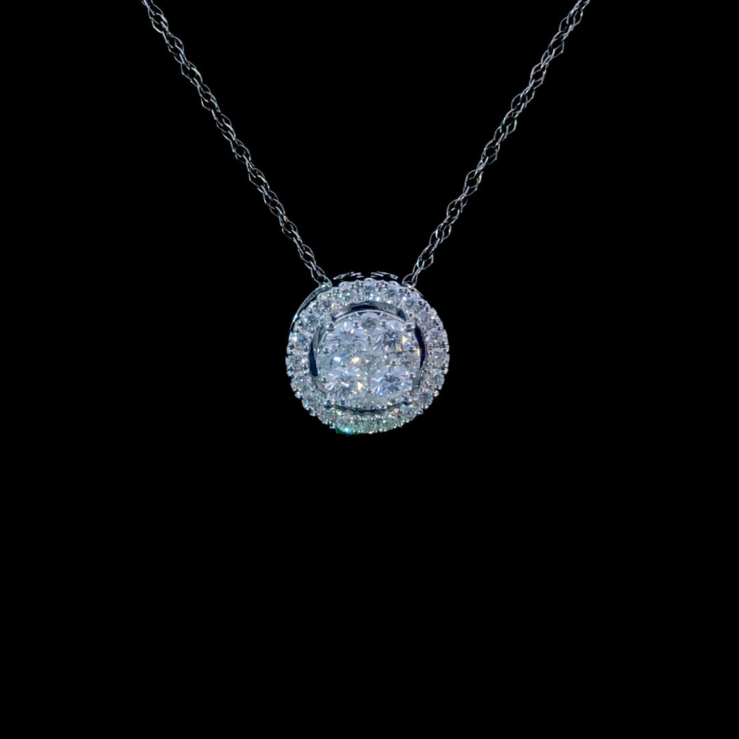 This stunning diamond cluster pendant showcases 0.50ctw of round diamonds set in radiant 14kt white gold. Its elegant design provides a gentle sparkle, making it a beautiful addition to brighten your everyday style. Chain is not included.