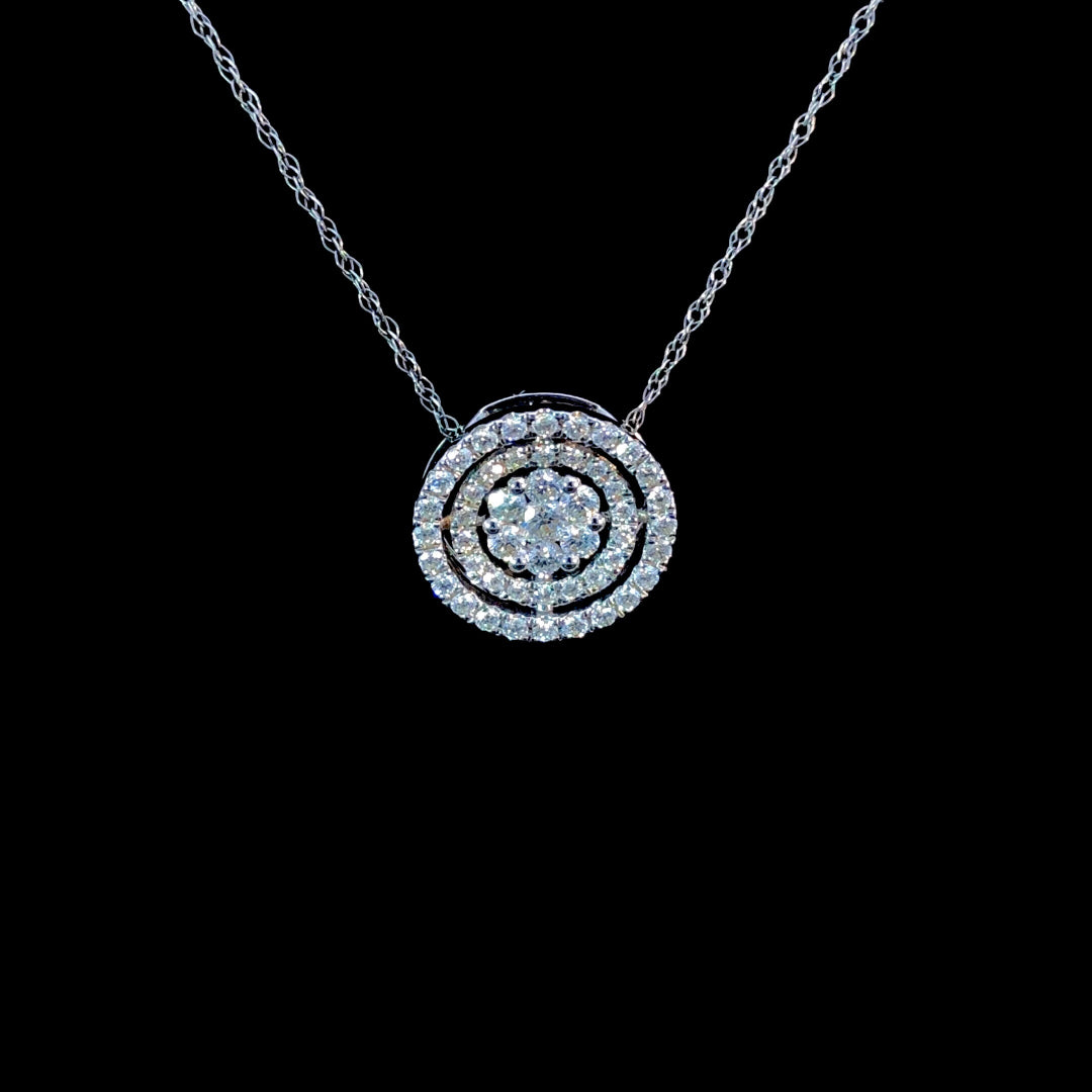 This exquisite diamond cluster pendant features a total diamond weight of .50ctw, beautifully set in 14kt white gold. Its elegant cluster design enhances the sparkle and brilliance, making it a perfect statement piece to elevate any outfit with timeless sophistication. Chain is not included.