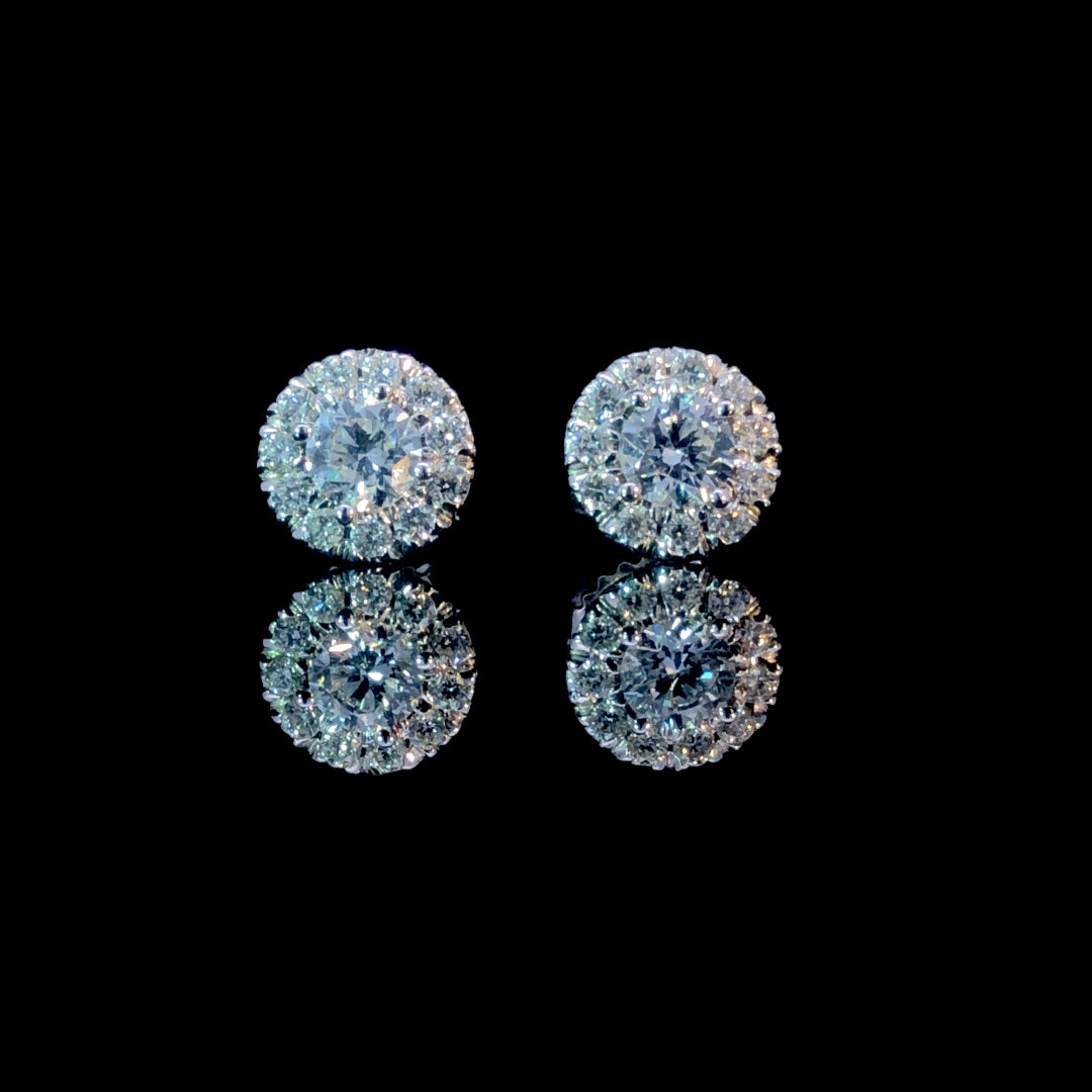 These stunning diamond stud earrings showcase a round center diamond surrounded by a halo of smaller round diamonds, totaling 1.00ctw. Set in 14kt white gold, their elegant design adds brilliant sparkle and timeless beauty, making them a perfect choice to enhance any look with confidence.