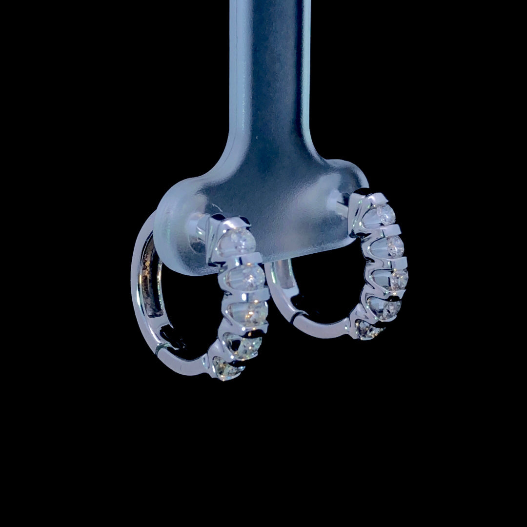 These diamond hoop earrings showcase 0.50ctw of round diamonds set in 14kt white gold. Their classic design offers a subtle sparkle that enhances any outfit, making them a versatile and elegant addition to your jewelry collection.