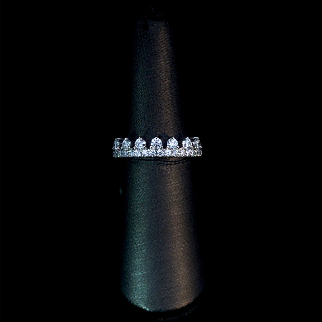 This beautiful band highlights a unique design set with 0.66ctw of round diamonds, all sparkling in radiant 14kt white gold. Its refined elegance makes it a meaningful choice for marking special occasions or adding a touch of brilliance to your everyday style. This ring is a size 7. If that size is not a perfect fit, first time sizing is free at the time of purchase. Additional sizing fees may apply.
