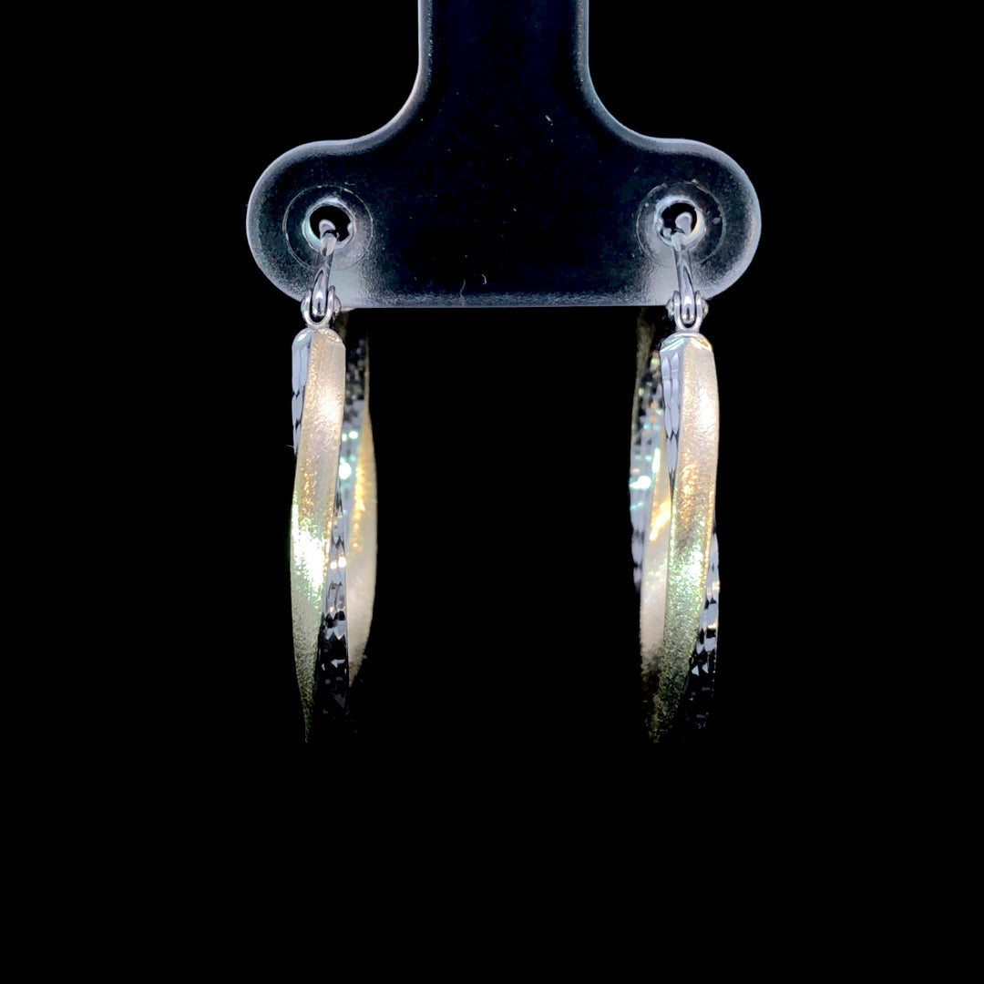 These 10kt two-tone gold hoop earrings showcase a unique design featuring smooth yellow gold intertwined with white gold, enhanced by diamond-cut detailing. Their elegant combination offers a refined look that complements any outfit, providing both style and subtle sophistication.