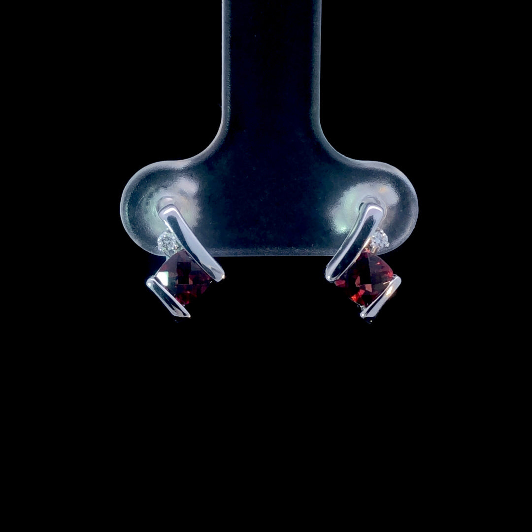 These earrings showcase vibrant garnets complemented by a delicate diamond accent, all set in 10kt white gold. Their striking combination offers a graceful and eye-catching accessory perfect for adding color and elegance to your everyday look.