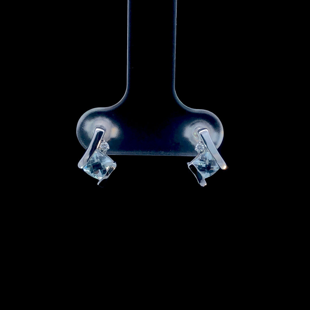 These beautiful earrings showcase aquamarine gemstones paired with delicate diamond accents, all set in a polished 10kt white gold setting. Their refined design offers a graceful sparkle, perfect for adding a subtle yet meaningful touch to your everyday look or special occasions.