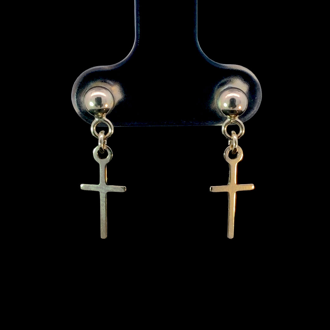 These 14kt yellow gold earrings feature a polished yellow gold bead with a delicate cross dangling below. Their graceful design offers a meaningful and stylish accessory that suits everyday wear with a touch of elegance.