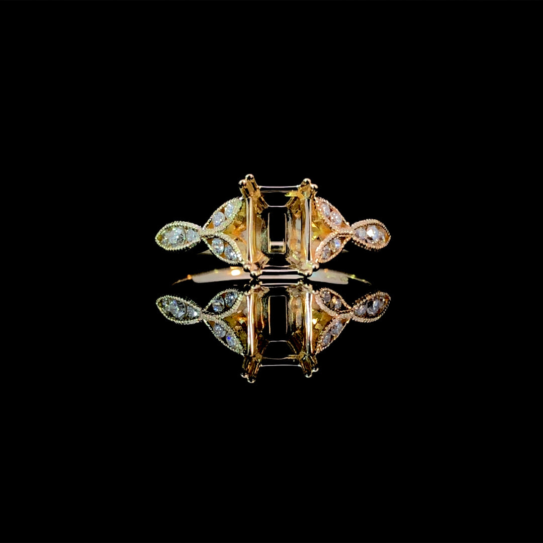 This elegant diamond semi mount beautifully highlights your selected center stone with .19 ctw of round diamonds arranged in a graceful floral pattern on the sides. Set in warm 14kt yellow gold with delicate milgrain detailing, this piece offers a timeless and refined foundation for creating a jewelry design that is truly your own. Price is for the semi mount only. Center stone will be added at an additional cost. This ring is a size 7. If that size is not a perfect fit, first time sizing is free at the time of purchase. Additional sizing fees may apply.