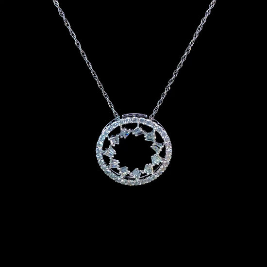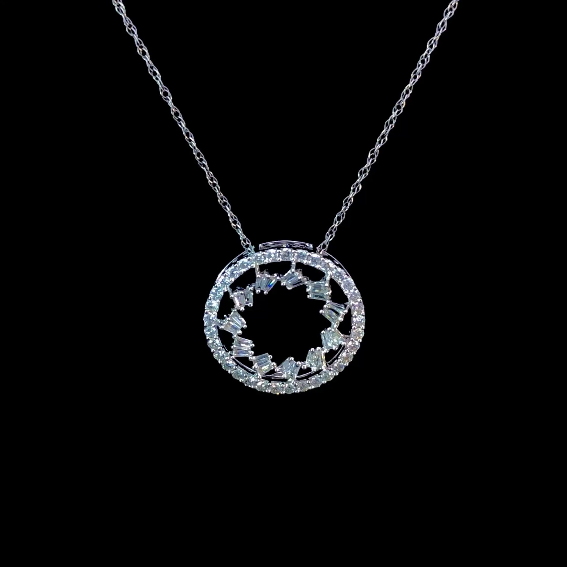 This elegant circle pendant features a captivating arrangement of round and baguette diamonds totaling .54ctw, crafted in lustrous 18kt white gold. The thoughtfully designed layout creates a dynamic sparkle that catches the light beautifully, making it a versatile piece perfect for everyday elegance or special occasions. Whether you're treating yourself or searching for a meaningful gift, this pendant offers timeless sophistication and lasting brilliance. Chain is not included.