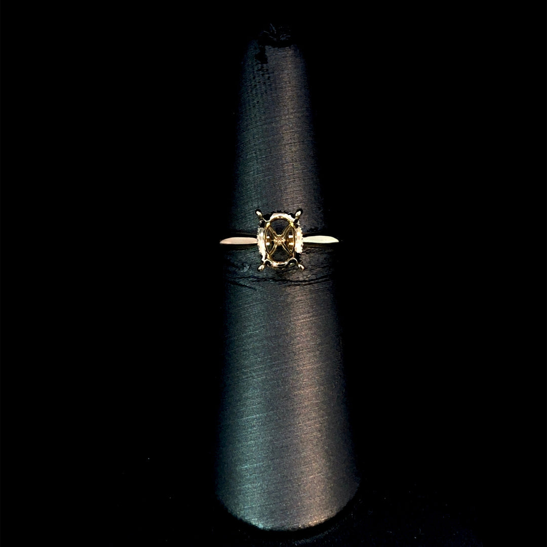 Create your dream engagement ring with this chic semi mount, crafted in 14-karat yellow gold with a polished, streamlined band. A hidden halo of .06ctw in round diamonds frames where your chosen oval center stone will rest, adding subtle sparkle and dimension. Select from our collection of premium oval diamonds or gemstones to complete this piece, allowing you to design a ring as distinctive as your love story. Price is for the semi mount only. Center stone will be added at an additional cost. This ring is a size 6. If that size is not a perfect fit, first time sizing is free at the time of purchase. Additional sizing fees may apply.