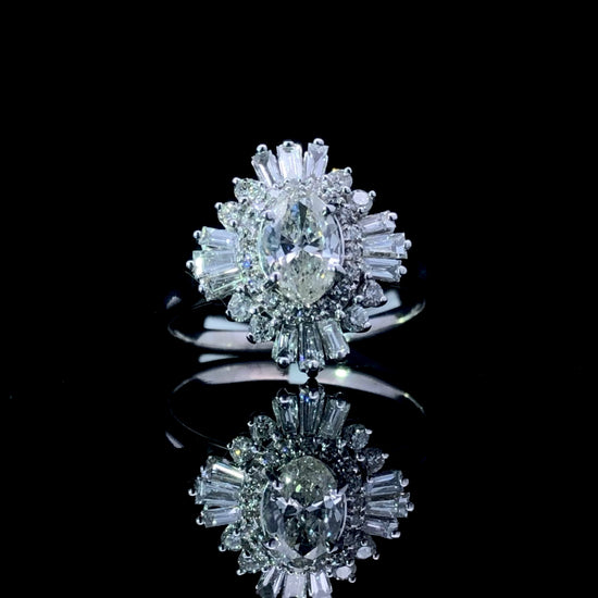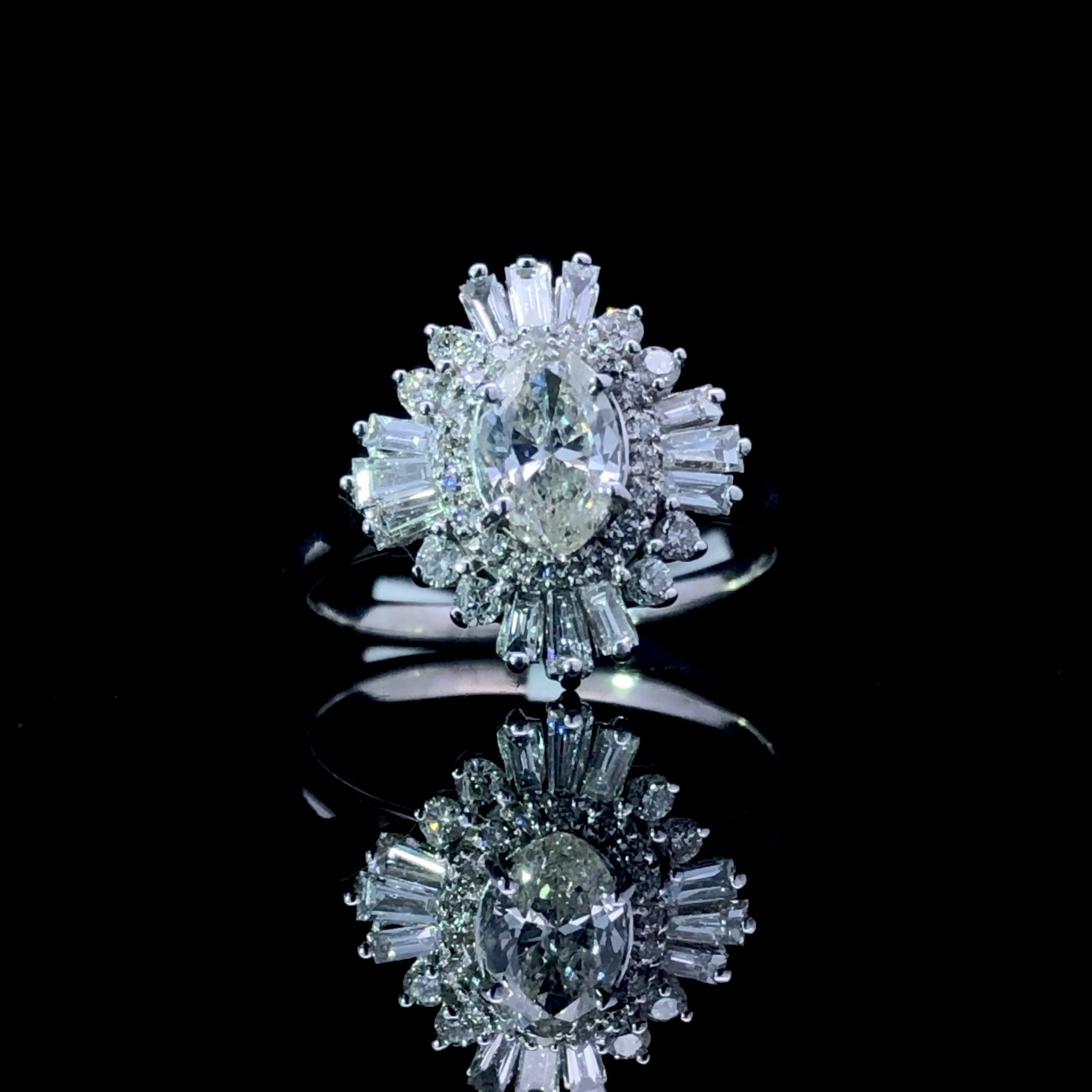 Adorn your finger with this exquisite ring, beautifully crafted from 14kt white gold. At its heart lies a stunning .53ct oval diamond, encircled by a shimmering halo of round and baguette diamonds for a stunning total carat weight of 1.25ctw. Wear this luxurious ring and exude an aura of sophisticated elegance. This ring is a size 7. If that size is not a perfect fit, first time sizing is free at the time of purchase.