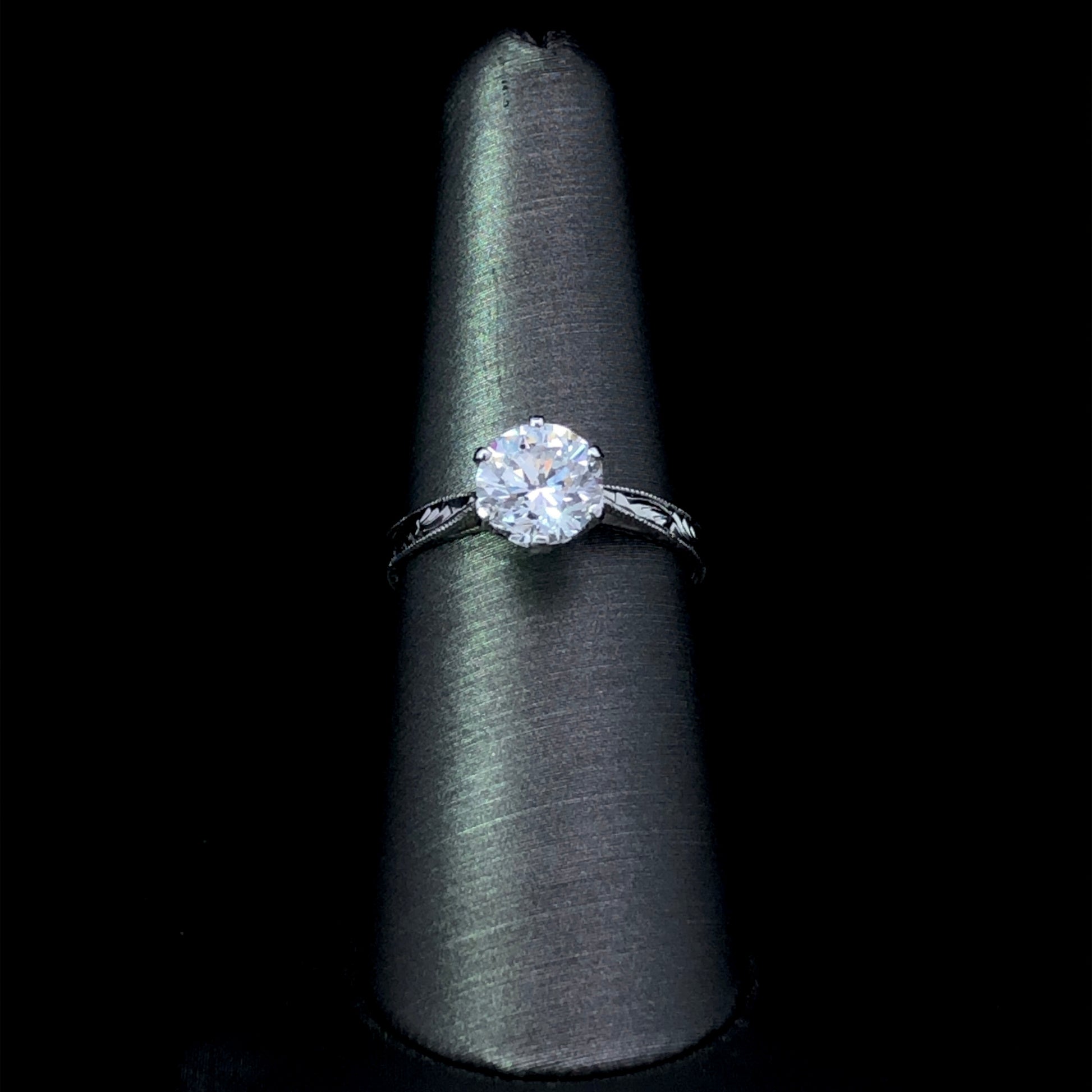 Adorn your hand with the timeless sophistication of this ring. Designed with a gorgeous certified 1.51 ct round stone, set in a decorative engraved platinum mounting, it exudes a sophisticated air that is sure to turn heads. A truly luxurious piece crafted for a lifetime of admiration. This ring is a size 7.25. If that size is not a perfect fit, first time sizing is free at the time of purchase. Additional sizing fees may apply. Diamond is certified to be a G in color and a SI3 in clarity.