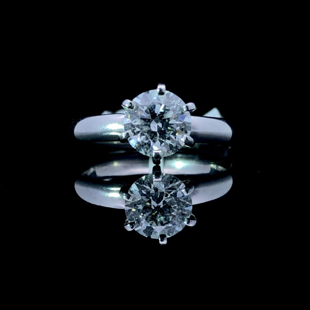 Add timeless elegance to any look with this classic solitaire ring. Featuring a round 1.08 ct diamond, set atop a timeless mounting of 6 prongs crafted from polished platinum for a truly luxurious finish. Perfect for special occasions or everyday glamour, this exquisite piece will be cherished for generations to come. This ring is a size 4.5. If that size is not a perfect fit, first time sizing is free at the time of purchase.