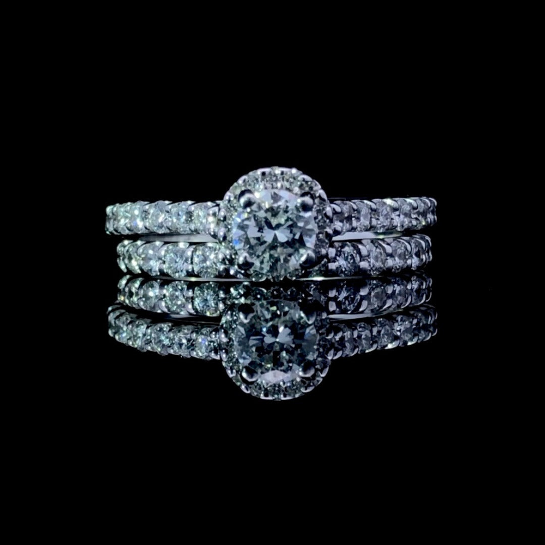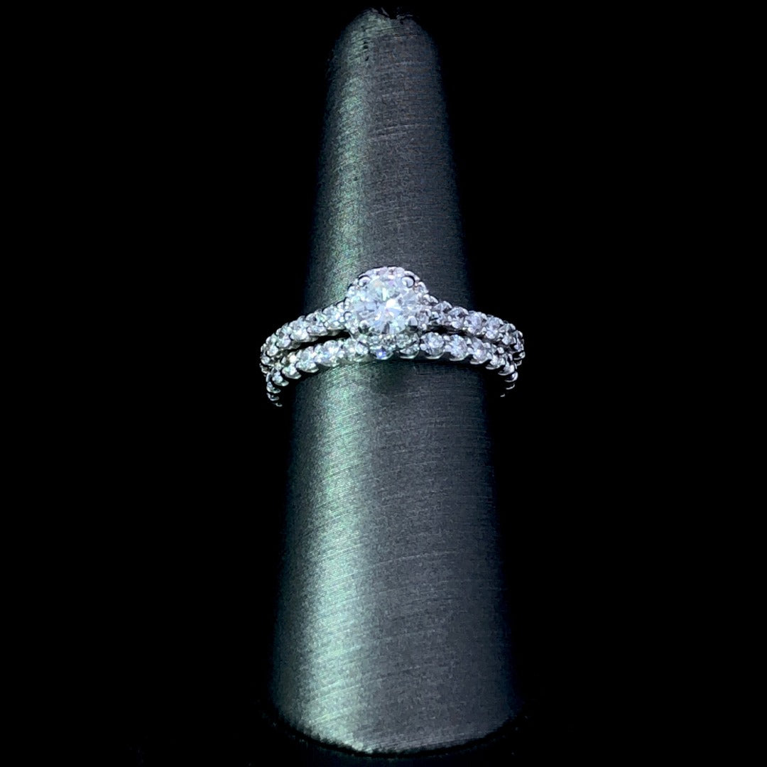Luxuriate in the breathtaking brilliance of this exquisite 14kt white gold ring. The dazzling .40ct round diamond at the center is set amidst an alluring halo of diamonds for a mesmerizing .61ctw total, making a statement that is at once timeless and sumptuous. Complete the perfect look with the 14kt white gold .60ctw matching diamond band (SOLD SEPARATELY). These rings are a size 7. If that size is not a perfect fit, first time sizing is free at the time of purchase.