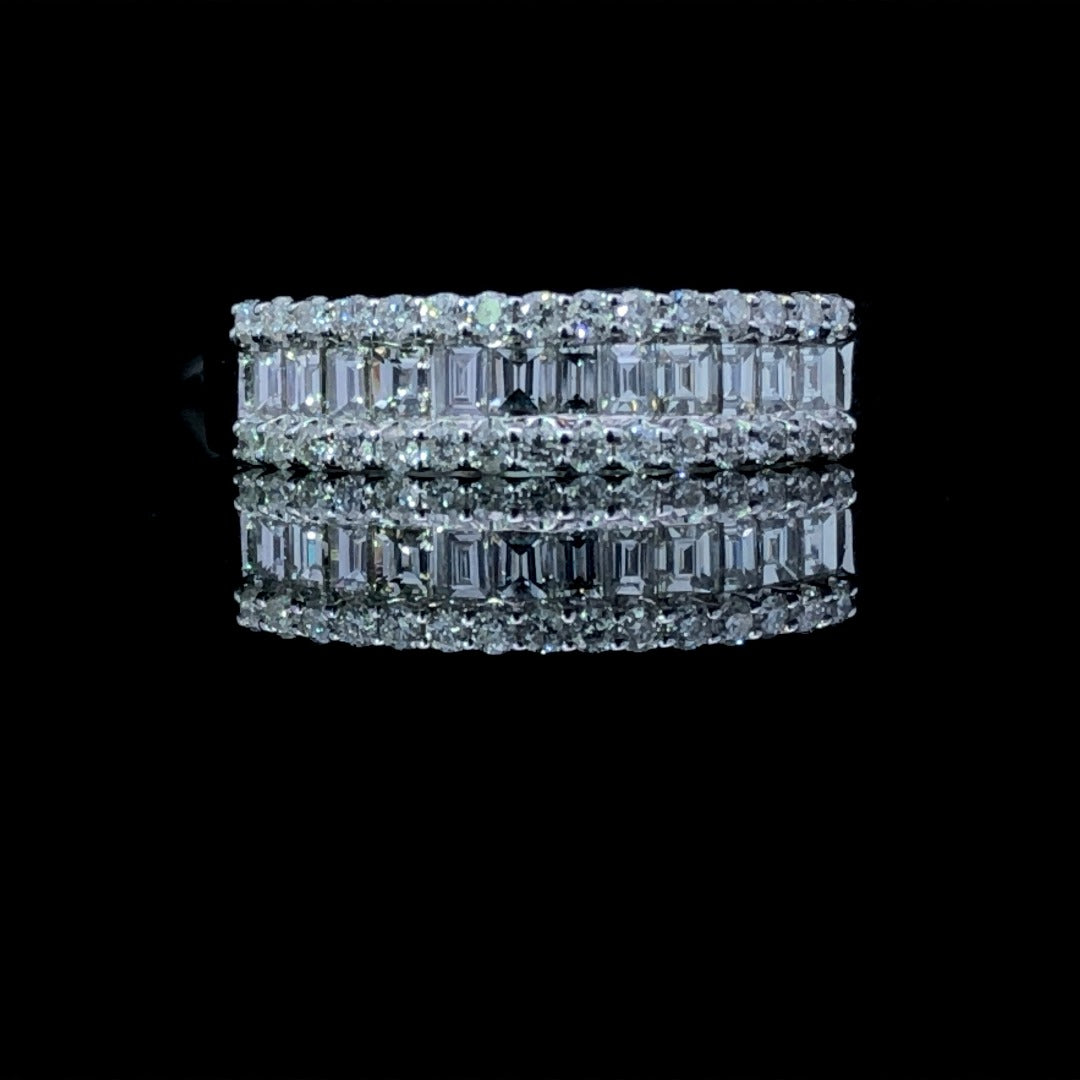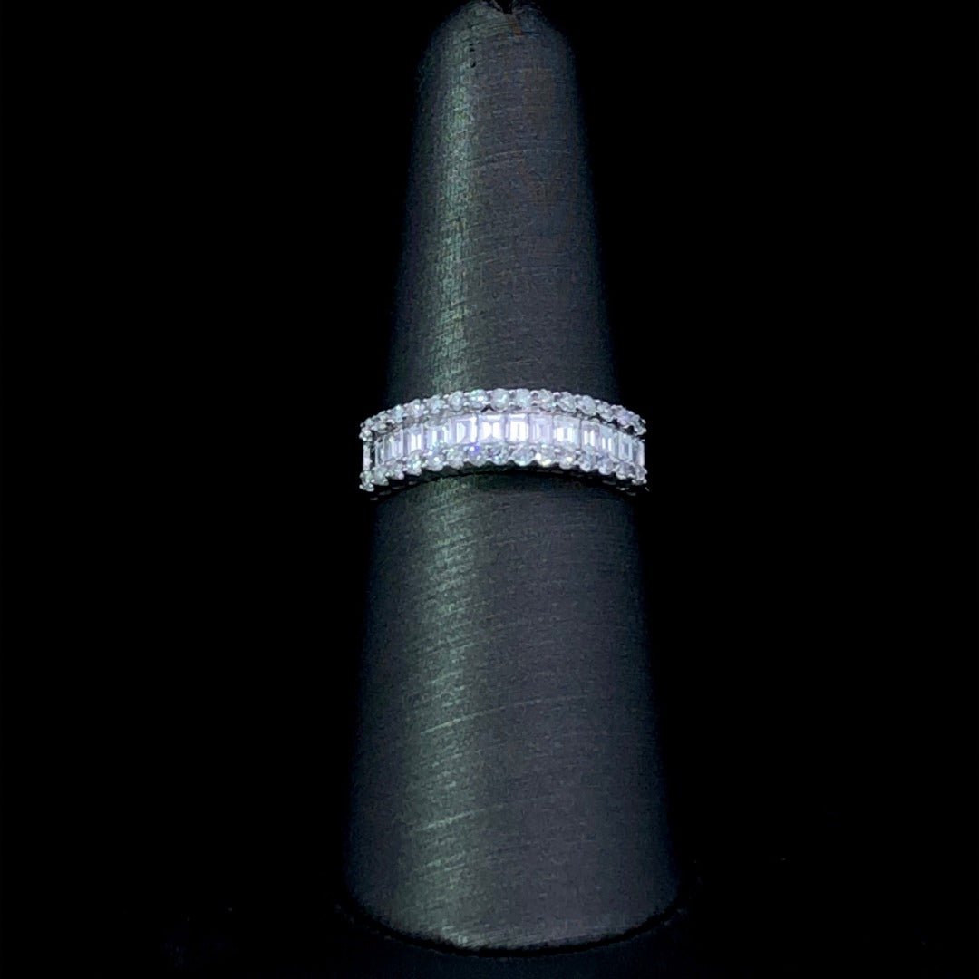Presenting the perfect token of timeless love, this exquisite anniversary band is finely crafted in 14kt white gold and set with an exquisite array of brilliant round and baguette diamonds totaling 0.84ctw. Offering sublime elegance and a sparkle that never fades, this timeless piece is a breath-taking gift that will remain cherished for generations. This ring is a size 7.5. If that size is not a perfect fit, first time sizing is free at the time of purchase.