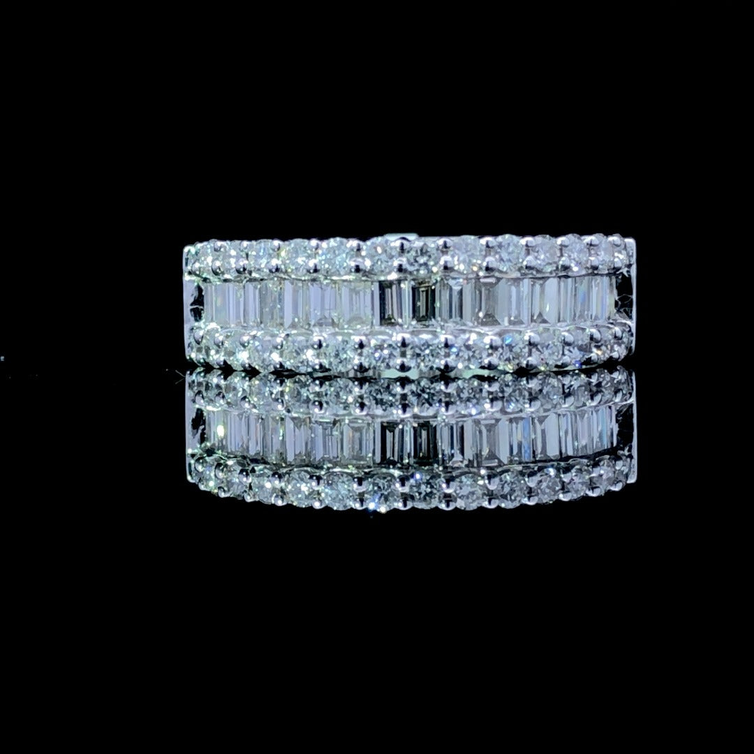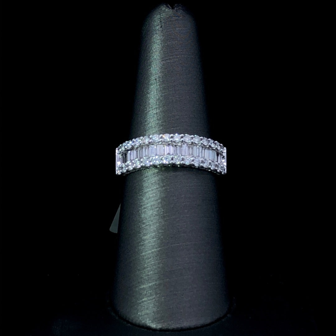 Celebrate your love story with this elegant yet eye-catching anniversary band. Crafted from 14kt white gold, it shimmers with 1.02ctw of exquisite round and baguette diamonds, creating the perfect illustration of your enduring bond. This ring is a size 7.5. If that size is not a perfect fit, first time sizing is free at the time of purchase.