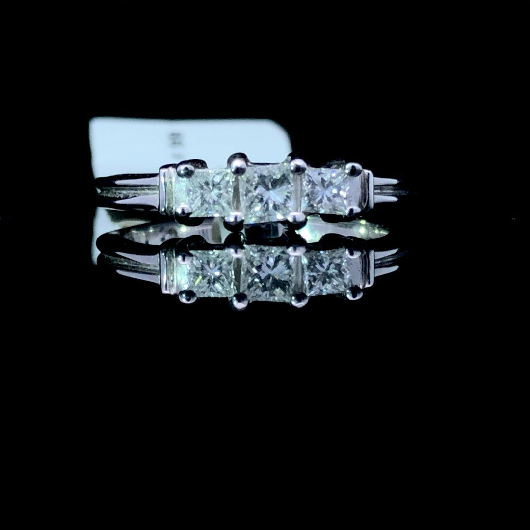 Experience timeless elegance with this exquisite 3 stone ring. Crafted from 14kt white gold, it features 3 stunning princess cut diamonds that total .50ctw for a truly dazzling effect. Enjoy unparalleled brilliance every time you wear this stunning ring. This ring is a size 6.5. If that size is not a perfect fit, first time sizing is free at the time of purchase.