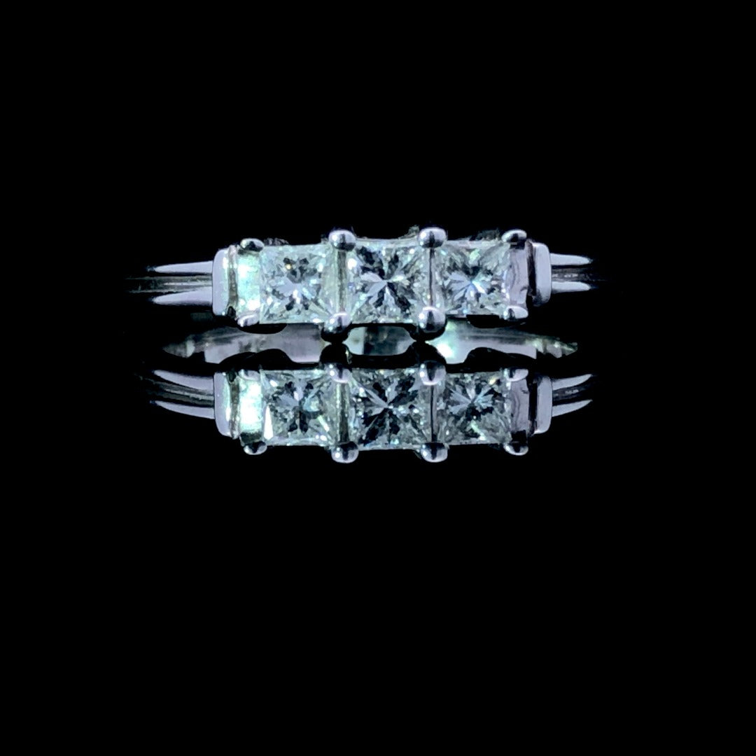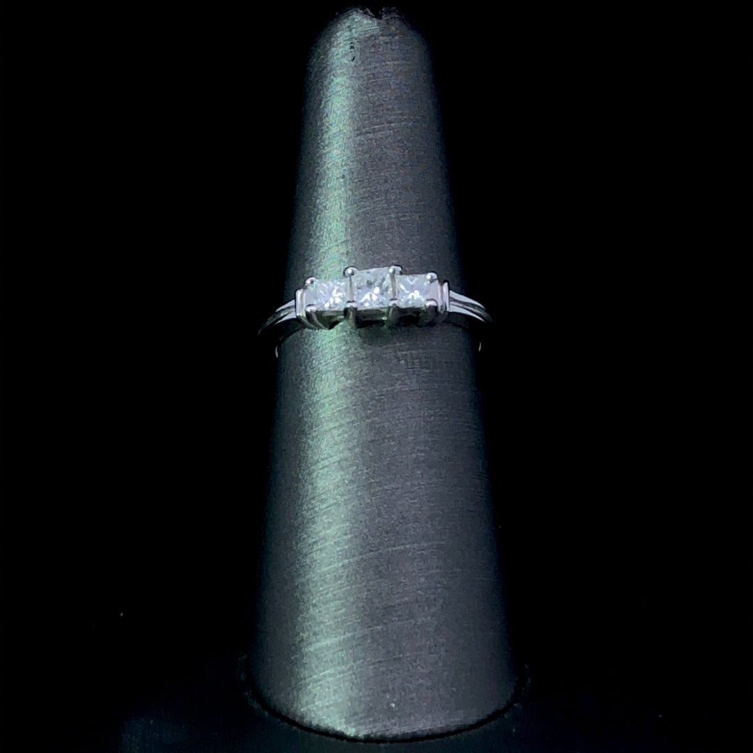 Step into luxury with this stunning ring! Crafted with 14k white gold and three dazzling princess cut diamonds totaling .50ctw, this gorgeous piece turns heads and will always be a classic. Add some sparkle to any look with this timeless treasure. This ring is a size 7. If that size is not a perfect fit, first time sizing is free at the time of purchase.