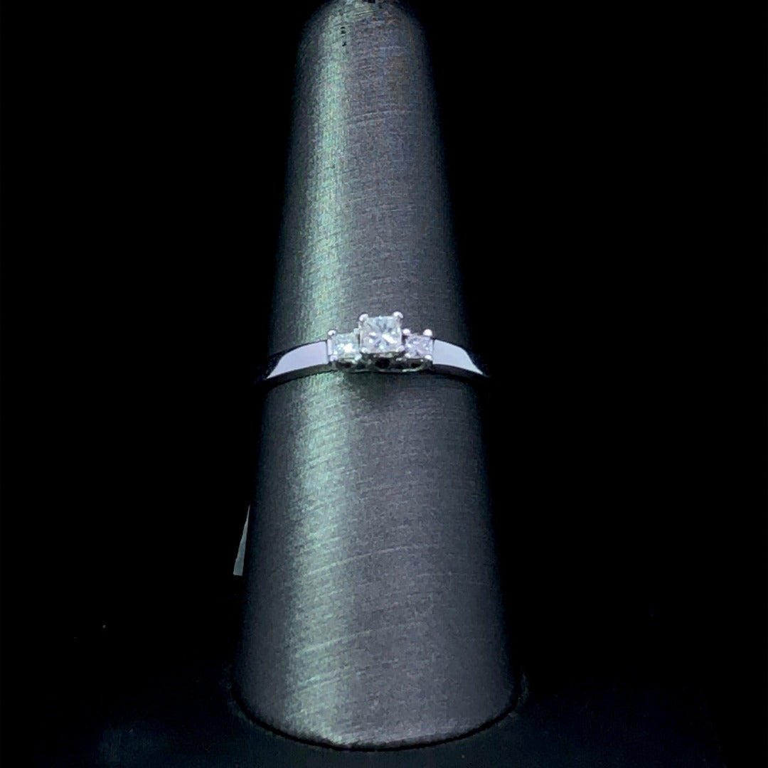 Enchant your loved one with this exquisite 3 stone ring, crafted with .28ctw of sparkling princess cut diamonds set in a timeless 14kt white gold setting. Inspire admiration and longing with its elegant and timeless design; perfect to express commitment, love, and devotion. This ring is a size 8. If that size is not a perfect fit, first time sizing is free at the time of purchase.