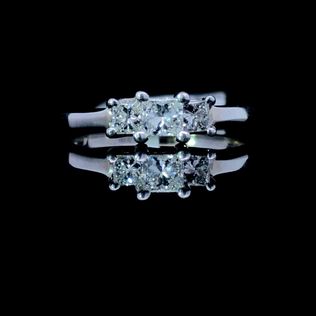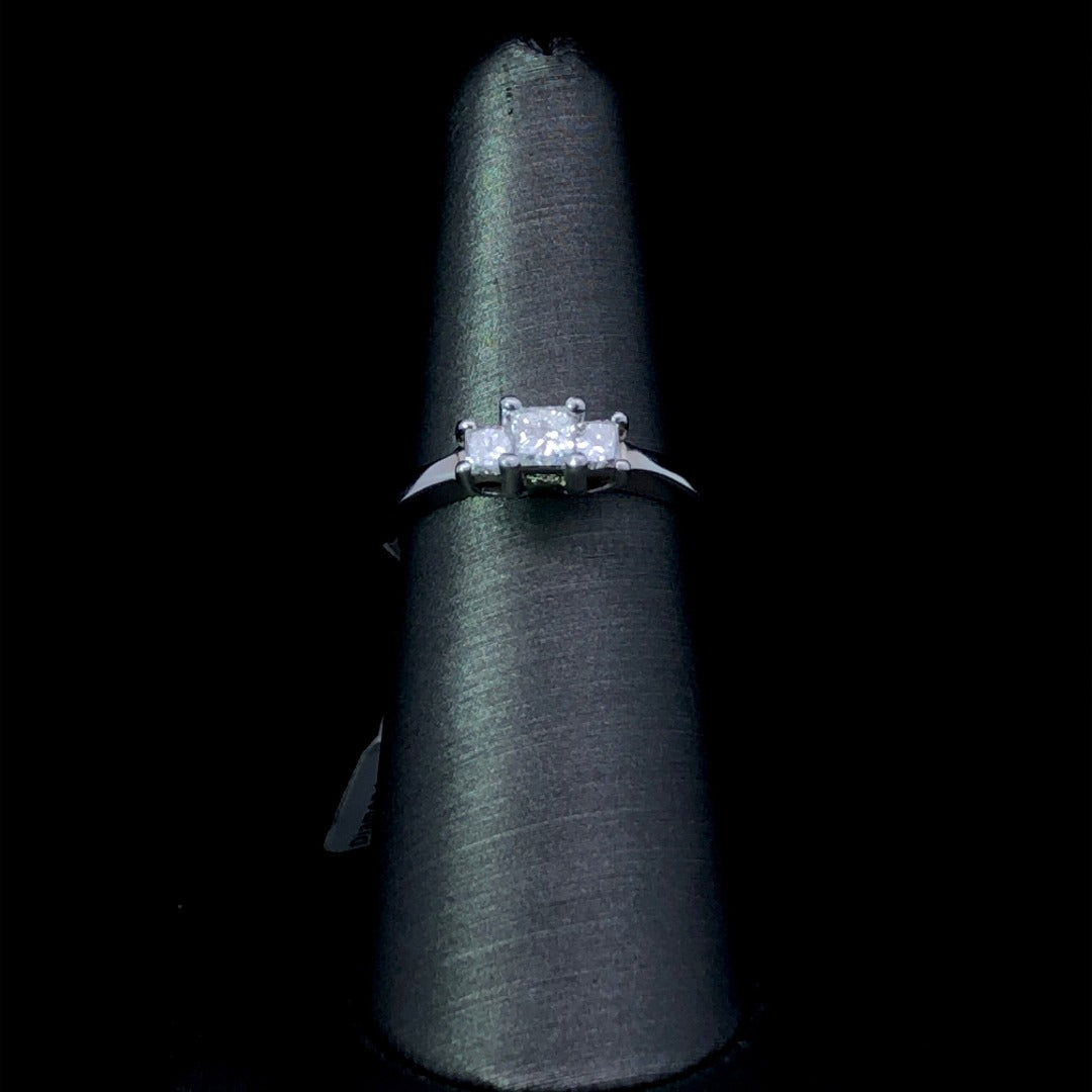This stunning ring showcases three dazzling princess-cut diamonds totaling .45ctw in brilliant platinum and 14kt white gold - an exquisite combination that sparkles from every angle. Showcase your unique style and personality with this timeless design. This ring is a size 6.5. If that size is not a perfect fit, first time sizing is free at the time of purchase.