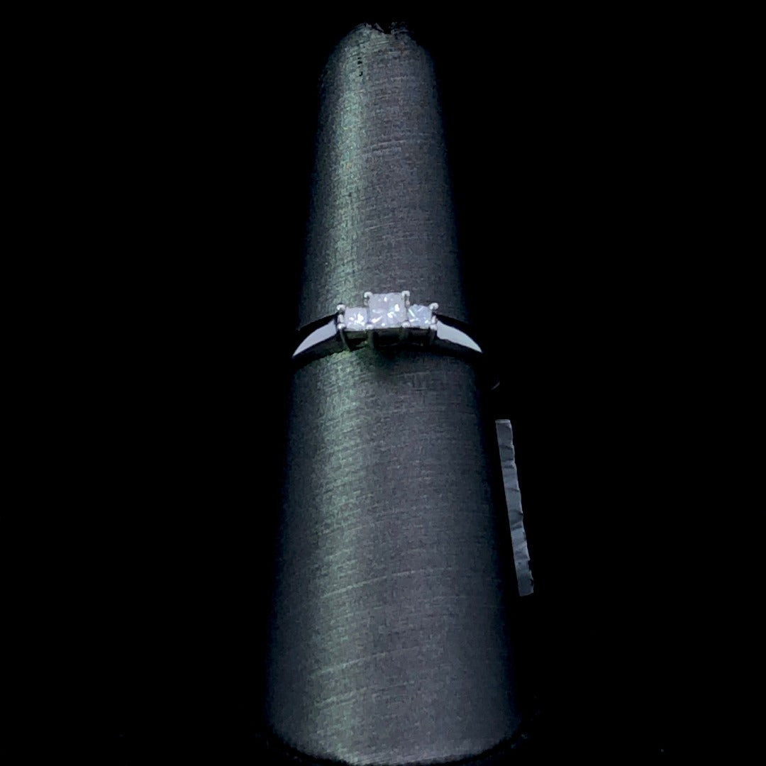 Present an elevated style with this elegant 14kt white gold ring. Generously set with three dazzling princess cut diamonds totaling 0.25ctw, it has a distinctly luxurious feel. Perfect for celebrating any special occasion, this piece is sure to become a treasured heirloom. This ring is a size 6.75. If that size is not a perfect fit, first time sizing is free at the time of purchase.